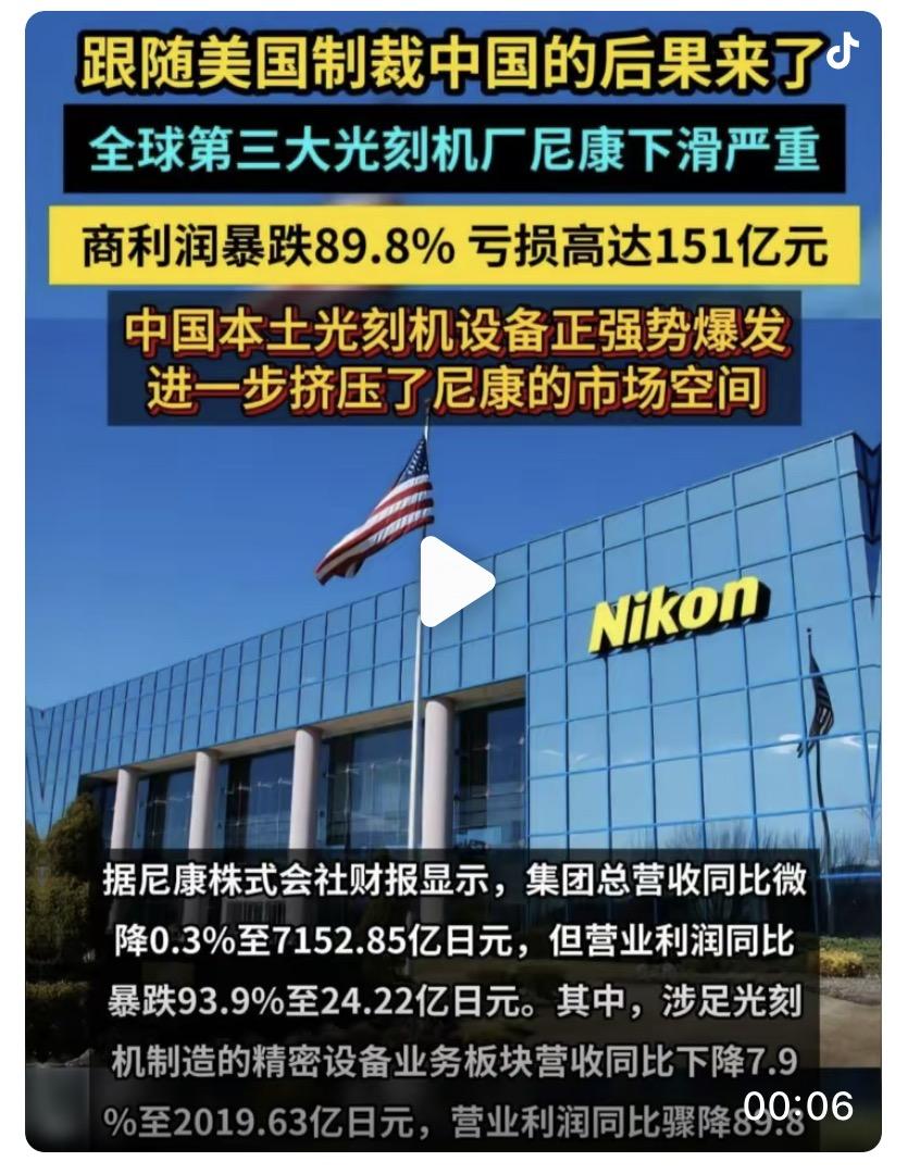 高市早苗头疼了!今天这件事我就用愉快的心情写,大家就用愉快的心情看,因为小本子先撑不住了,老特在中东搞的火热,一不小心把小本子给煎了,你说好笑不好笑,事情是这样的。日本光刻机巨头尼康崩了 要理解尼康的坠落,必须先看它曾经飞得有多高。 上世纪80年代,尼康是当之无愧的行业霸主。 1980年推出首台步进式光刻机,1982年就反攻美国市场,其稳定性远超美国GCA。 巅峰时期,尼康与佳能联手占据全球70%的市场份额,而彼时的ASML还只是飞利浦旗下一个在漏雨棚里挣扎的“小作坊”。 那时的尼康,代表着精密制造的最高水平,是日本“技术立国”的骄傲。 尼康的崩塌始于两次关键的技术路线选择失误。 第一次是2004年的“浸润式光刻”之争。 面对193nm波长的物理极限,台积电工程师林本坚提出用水做介质的“浸润式”方案。 尼康因已在157nm干式光刻上投入巨资,傲慢地拒绝了这一“离经叛道”的想法,甚至施压封杀该技术。 结果ASML抓住机会,与台积电合作推出浸润式光刻机,性能碾压尼康,短短五年就夺走了半壁江山。 第二次是EUV(极紫外光刻)的“闭门造车”。 在浸润式技术失利后,尼康试图通过全自研EUV翻盘,累计投入超千亿日元。 但美国为了扶持ASML,将尼康排除在EUV技术联盟之外,切断了光源和光学系统的供应。 当ASML集结全球供应链(德国蔡司镜头、美国Cymer光源)突围时,尼康的EUV原型机只能在实验室吃灰,最终不得不宣布终止商业化。 如果说技术失误是慢性病,那么跟随美国制裁中国则是尼康的“急性自杀”。 中国是全球最大的光刻机需求市场,也是尼康成熟制程设备(如i-line、KrF)最后的“避风港”。 2023年起,日本政府对23种半导体设备实施出口管制,尼康被迫对华断供。 数据不会说谎:2025年4-9月,尼康光刻机销量仅为9台,全年目标不得不从34台下调至29台。 而竞争对手ASML同期卖出327台,仅中国市场就贡献了80亿欧元销售额。 尼康不仅失去了订单,更失去了未来——中国本土光刻机(如上海微电子)正在快速崛起,一旦完成28nm以下制程突破,尼康在成熟市场的最后一点份额也将被吞噬。 尼康的“崩了”,对日本意味着什么? 首先是经济与就业的重创。 850亿日元的亏损导致尼康不得不关闭运营58年的横滨工厂,数千名高精尖技术人员失业。 其次是产业链的断裂。 光刻机是半导体产业的“心脏”,尼康的衰落意味着日本在上游核心设备领域彻底丧失话语权,只能沦为ASML的附庸。 更严重的是战略自主权的丧失,当美国需要时,日本必须牺牲企业利益“纳投名状”,这种“自杀式忠诚”正在摧毁日本最后的科技护城河。 看到这大家大概就会明白为什么尼康会失败,其实和柯达很像,日本人感觉有点钻牛角尖,他们的眼界很窄,虽然在精密制造上算得上优点,但是放在历史的趋势上,日本总是慢半拍。 我觉得这个是主要原因,次要原因就是美国了,当美国的敌人很危险,当美国的盟友很致命。 这句话听着像一句玩笑话,但是背后折射的现象却是细思极恐,日本可以说是守着百亩良田饿死了,我国对于日本的半导体支持还是很大的,尤其是美国不让阿斯麦卖光刻机给我们以后,这对于尼康来说是很好的机遇,也是翻身的最好的机会,但是它跟随美国制裁我们,也喝下这瓶毒药。 当我们的半导体被逼上绝路之后 ,那么这块良田只有我们自己开垦,我们的科学家夜以继日的钻研,对于半导体其实我们有很多自己的见解,EUV虽然先进,我们是不是可以从其他渠道着手,比如碳基芯片,量子芯片等,这些都极大的推动了芯片的发展。 华为,中芯国际等半导体企业更是扩展了芯片的设计面,比如华为提出了堆叠方案,虽然看起来像是走弯路,但是至少我们在求变革,求发展,如今华为的麒麟9030性能直追高通旗舰芯片,当然用的是我们自己的光刻机 ,这也意味着日本的路子被堵死了。 从这件事我们也学会很多,核心科技必须掌握在自己手中,国家的主权真的是神圣不可侵犯,当然我之所以能说出这些话,都是我国可爱的科研工作者,日以继夜的努力换来的,他们让我们挺起了脊梁,为他们点赞!