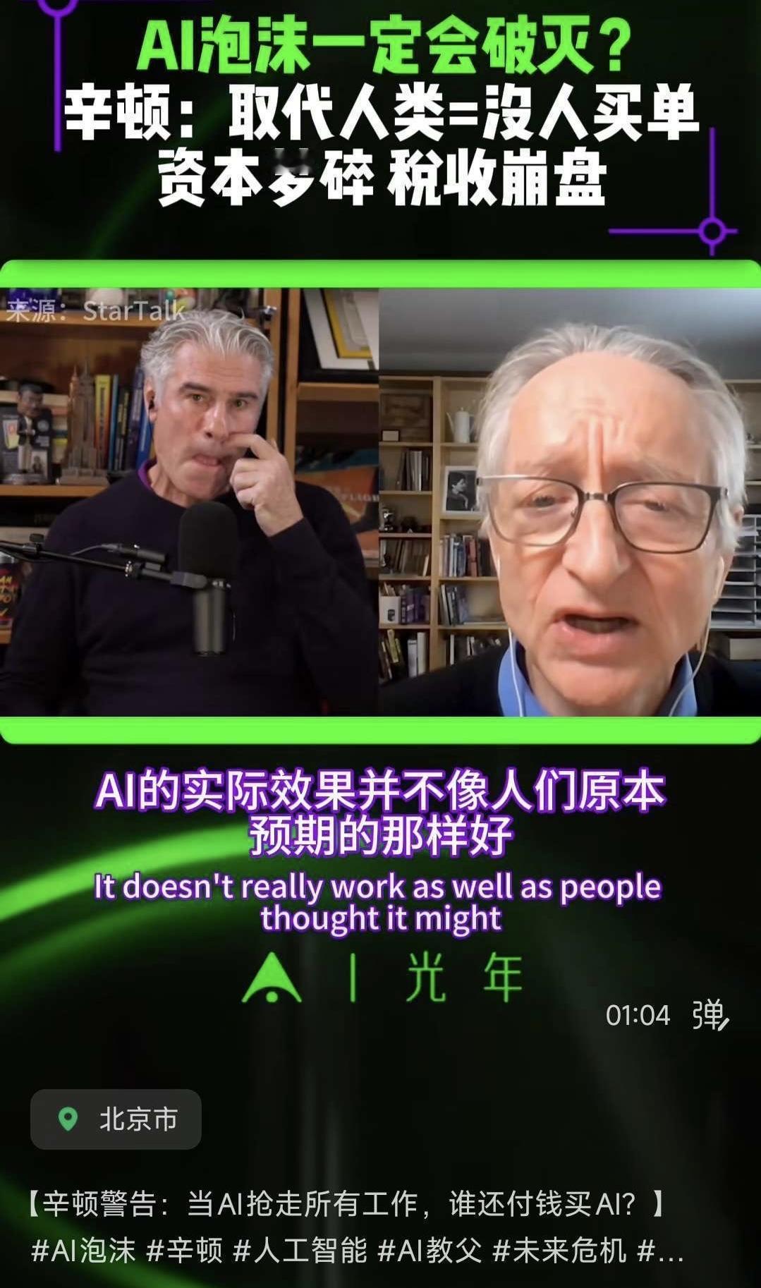 关于AI这位诺奖物理学家道出实情 辛顿早就戳破AI最大困局:一旦AI取代所有人的工作,人们便没了收入,无人消费,最终无人为其买单,再聪明的AI也不过是自毁的泡沫。 AI能够无限聪慧,却永远无法体悟快乐;人类无需绝顶聪明,却拥有AI永远无法取代的感受、温情与活着的意义。 一味追逐更“聪明”的AI,却破坏人类的生存与幸福,这并非进步,而是本末倒置,是文明最大的悲剧。 技术应当服务于人,而非让人沦为多余。守护健康、幸福与快乐,才是人类永恒的正道。