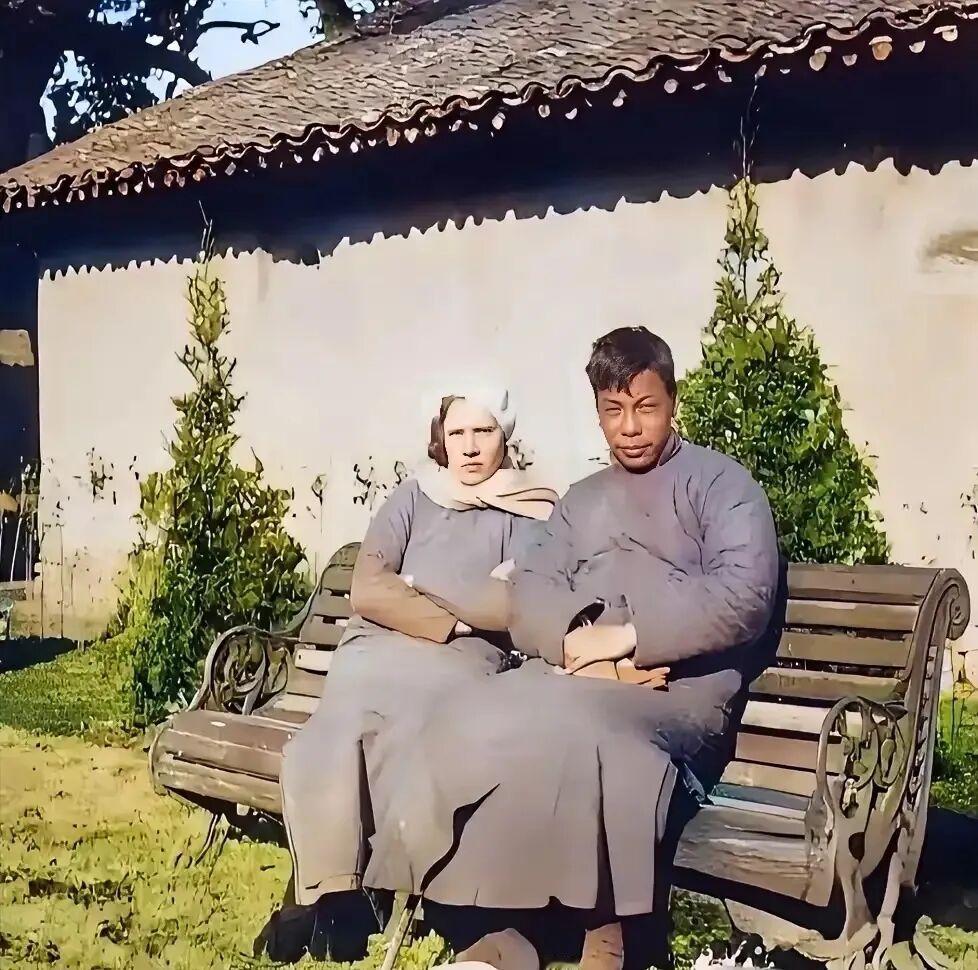 照片拍摄于1939年12月,浙江奉化溪口镇蒋家老宅,蒋经国的母亲毛福梅在日军空袭中遇难,他与妻子回乡为母守孝。照片中蒋经国面容憔悴、眼窝深陷,蒋方良是典型的白人相貌,表情凝重。