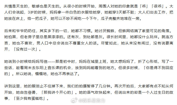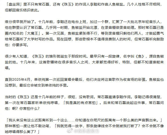 单依纯采访时哭了 单依纯在《人物》采访中谈及童年经历时忍不住落泪,小学三年级父母离婚,她被送到乡下和爷爷奶奶一起生活。老人家虽然疼爱她,却给不了细腻的关怀,她常常一个人点蜡烛、一个人吃生日蛋糕,安静又懂事。给妈妈写信也常常得不到回应,慢慢就不再表达自己的情绪。《珠玉》的旋律辗转多年,直到遇见单依纯。作词人李聪第一次听她哼唱时,甚至有点害怕,不敢轻易动笔填词,生怕文字打断了那份绝美的旋律。她的声音干净又有故事感,一开口就足够动人。