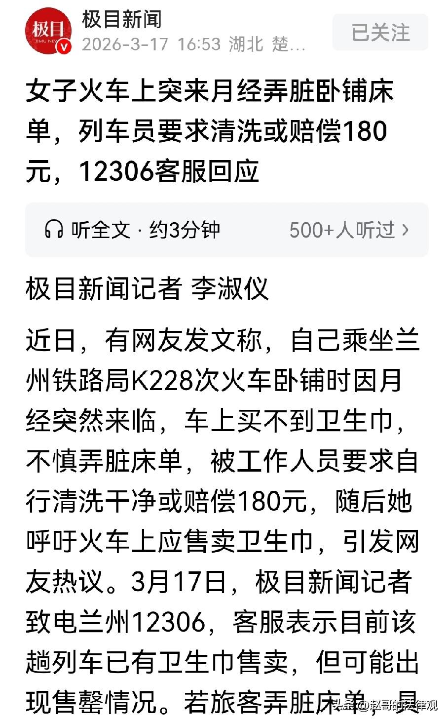 甘肃兰州,女子乘坐K228次列车卧铺时,赶上了生理期,可她在车上没有买到卫生巾,虽然她很是小心翼翼,但还是把卧铺床单弄脏了。不料,工作人员要求她要么把床单清洗干净,要么赔偿180块钱,无奈之下,女子只好在火车的水池里清洗了床单。女孩哭诉: 在需要过夜的火车上,我买不到一片卫生巾。 张女士怎么也没想到,坐趟火车能尴尬成这样。 虽然事情过去大半年了,但她考虑后,还是把这段经历发到网上。 2025年10月9号,她外出乘坐K228次列车,全程10多个小时,得在卧铺上过一夜。 上车前,她一切正常,可能是因为突然改变生活规律,半夜突然来例假了。 她的生理期不太规律,有时候提前有时候推后,根本算不准。 这次出门也带了卫生巾,但量没估对,熬到半夜就用完了。 她想在火车上买一包,问了一圈,没有。 列车上的售货小推车卖零食卖水卖纸巾,唯独没有卫生巾。 那时候车厢里大部分人都睡了,她也不好意思挨个去敲人家的铺位借。 只能把自己带的衣服叠了叠垫在身下,就这么小心翼翼熬了一宿。 第二天中午快到站了,她掀开被子一看,床单上还是沾了一块血渍。 那一瞬间她脸都红了,赶紧去找列车员,想说清楚情况,看能不能帮忙换一下。 列车员过来看了床单,态度倒是很平静,说的话却让张女士愣住了。 人家说:要么自己把床单洗干净,要么赔180块钱。 180块钱但是不算多,可张女士那会儿身上没带多少钱。 这笔钱对她来说不是小数目,无奈之下,最后她尴尬的选择洗床单。 列车员把她带到洗手池那边,给了她一点洗衣粉。 张女士就蹲在那儿,就着冷水一点一点搓那块污渍。 旁边偶尔有人经过,她头都不敢抬,耳朵根子烧得厉害。 好不容易洗干净了,她怕再弄脏,剩下的路程一直站着,再也没敢回铺位坐。 事后她越想越不是滋味,她知道自己弄脏床单确实不对,损坏东西要赔偿,这个道理她认。 但她想不通的是,火车上热水有卖的,零食有卖的,纸巾也有卖的,卫生巾也是女乘客的刚需,怎么就偏偏没有呢? 她把这事儿发到网上之后,评论区炸了。 好多女网友都说有过类似的经历。 有个女孩也是从兰州坐火车出发的,同样因为月经不规律弄脏了床单。 跟列车员说了之后,人家态度挺好,给换了新的,但也让把脏的那块洗干净。 说是洗不干净的话,列车员自己要被扣钱。 也有运气好的,弄脏了直接找列车员,人家二话不说就给换了新床单,压根没提赔偿和清洗的事儿。 这事儿说到底,两边都有难处。 乘客这边,月经这事谁能算得准? 尤其那些月经不调的女性孩们,提前来推后来,根本由不得自己。 真遇上了,火车上连个应急的卫生巾都买不到,只能干着急。 列车员那边也不容易,床单弄脏了得处理,洗不干净可能真要扣工资,她们也只是按规定办事。 卫生巾这种需求说大不大说小不小,备多了卖不掉浪费,备少了又不够用。 女子发的帖子在网上流传,有人了解情况,据说现在K228次列车已经有卫生巾卖了。 但火车上流动性大,备货不一定充足,卖光了也有可能。 至于床单弄脏了,到底该怎么办?客服说具体处理方式得问列车上的工作人员。 能洗干净就换床单,洗不干净得看车上有没有相关规定。 至于赔偿180块这个数是怎么定的,客服也说不上来,得问铁路相关部门。 这事,到现在也没个明确说法。 张女士那180块钱倒是没赔,但她蹲在火车上洗床单的那一幕,一辈子都忘不了。 她发帖不是为了要个说法,就是觉得这种尴尬事,不该让女乘客一个人扛着。 一包卫生巾,对遇上突发情况的乘客来说,可是救急的东西。  《铁路旅客运输规程》第一百零一条规定:旅客应当爱护铁路设施设备,不得损坏、污损车站、列车设备。 乘客乘坐火车时,确实应当遵守保持车厢设施清洁的义务。 但张女士弄脏床单,是因生理期这种正常生理现象,不是故意,或重大过失。 而且票价中,通常已包含卧具使用与清洁成本,只要污渍,可通过常规洗涤去除,铁路方无权另行收费。 同时,180元的赔偿金额铁路部门未公示定价依据,涉嫌不合理收费。 此外,虽然目前铁路局对列车上配备卫生巾这类卫生用品没有明确规定。 有人认为,任何乘客都应该为自己的行为买单,不管是有意还是无意,都该为自己的过错承担相应的责任。 有人怼回去:女乘客买的卧铺,已经付钱,其中就包括清理卫生。 不是谁家的闺女,谁不心疼,凭啥让一个生理期的女孩子用冷水去洗床单? 对此你怎么看?