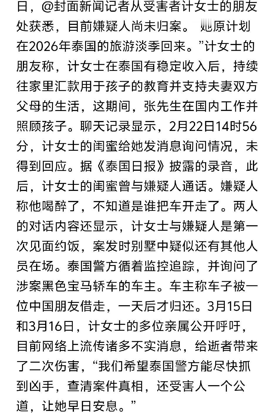 在泰国被害的中国女子计正娇家人说,她与这个烧烤店老板是第一次约饭。网上所说的娱乐陪同信息等等都不实。给家人造成了第二次伤害。这个赵天行,他开着烧烤店,在泰国待过很多年,熟悉泰国的地形。也结识当地一些中国老乡。他曾经有过两次犯罪经历。是一个烧烤群里,他约计正娇出去的。 计正娇在泰国有稳定的收入之后,每个月会固定打钱给老公作为孩子的抚养费,还给双方的父母转账。 2月22日14:56闺蜜收到计正娇的求救信息。打她电话打不通,闺蜜接着给赵天行打电话了。赵天行说他自己喝醉了不知道车去哪了,也不知道计正娇去哪了。实际上这个时候他已经把被害女子拉到238km外的地方丢水沟了 他的黑色宝马车,还是借别人的。目前他还在逃。