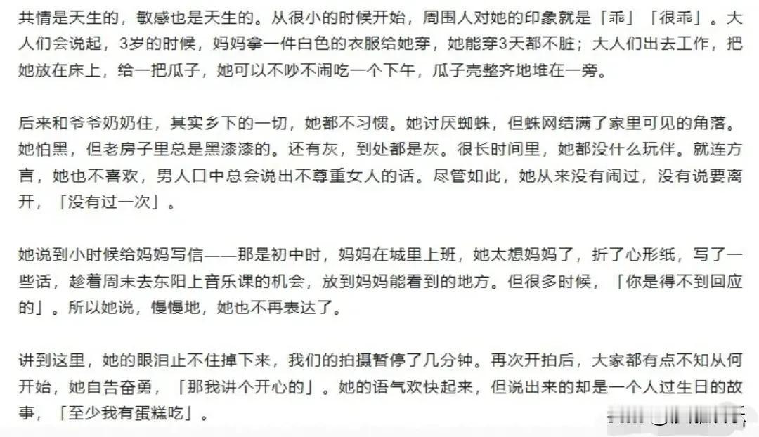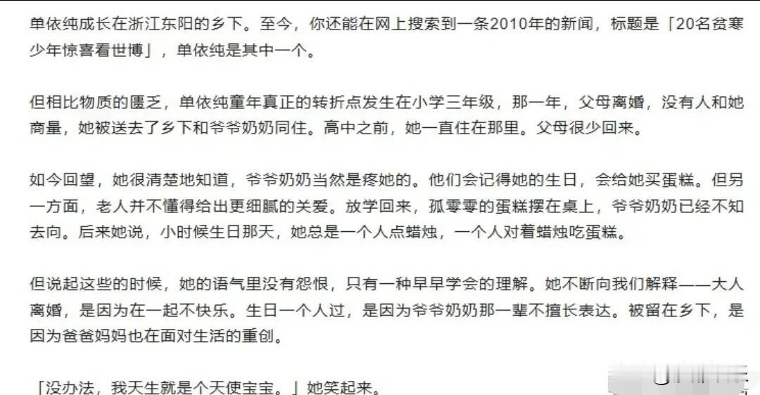 单依纯,难掩悲伤! 3月17日,一向低调的单依纯突然冲上热搜第一。不是因为新歌炸场,也不是因为造型翻车,而是她在《人物》深访里,罕见地撕开了童年那道最柔软的伤口,说着说着,眼泪止都止不住,拍摄不得不暂停了好几分钟 。 原来,那个能用歌声把人唱碎的女孩,心里一直住着一个孤独庆生的小小的她。 单依纯的童年,比我们想象的要清冷得多。小学三年级父母就离异了,没人和她商量,她就被“打包”送到了浙江东阳乡下跟着爷爷奶奶 。老人疼她,记得买生日蛋糕,但等她放学回家,往往只剩蛋糕孤零零地摆在桌上,爷爷奶奶早就出门忙去了。点蜡烛、许愿、吃蛋糕,全是她一个人。现在的她回忆起那个画面,居然是笑着说:“至少我有蛋糕吃” 。 这种“乖”让人心疼。3岁就能穿着白衣服3天不脏,为了不给人添麻烦,哪怕不习惯乡下的蛛网、黑暗和方言,也从来没闹过一句要离开 。初中的时候,她折了心形纸给城里的妈妈写信,却常常石沉大海 。慢慢地,她把所有情绪都锁了起来,只留给音乐。 很多人不理解,一个00后小姑娘,唱苦情歌为什么那么有“破碎感”?看看这段采访就全明白了。别人唱歌是技巧,单依纯唱歌是在“渡自己”。 童年那些没说出的话、没等到的回应,都成了她嗓音里的气泡音和颤音。 最绝的是,这种孤独甚至成就了那首神曲《珠玉》。作词人李聪回忆,第一次听单依纯哼唱,咫尺距离飘来的声音干净到让他“有点害怕”,迟迟不敢动笔,生怕世俗的词汇打断了这份纯粹 。你看,小时候的“无人问津”,长大后竟然成了创作者眼中的“不可玷污”。 小时候的决策权是零,被送到哪就去哪。现在的单依纯,却被整个乐坛小心翼翼地捧着。这种反差本身就是一部大女主剧本。网友辣评:“小时候蛋糕没人陪着吃,现在随便唱首歌,几百万网友排着队‘陪吃’。”这哪是逆袭,这简直是人生级别的治愈。 看完采访,最大的感受是:老天爷是公平的,他拿走你的陪伴,往往会多塞给你一副好嗓子作为补偿。 或许就像单依纯自己说的,音乐是唯一能让她安心的地方 。那个对着烛光默默许愿的小女孩,如今终于站在了万人中央,被灯光和掌声包围。这一回,她再也不用一个人切蛋糕了。 这也许就是生活最好的安排:那些让你哭过的事,总有一天,你能笑着唱出来,而且唱得比谁都动听。