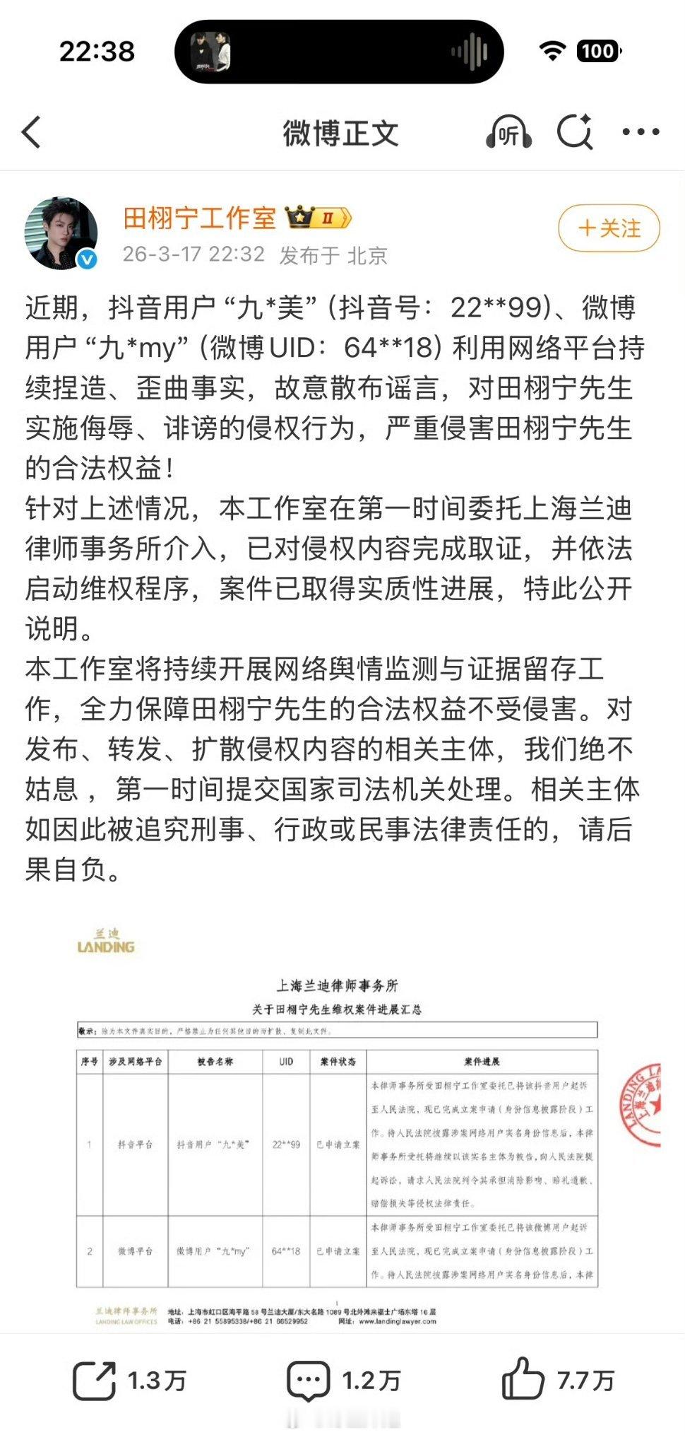 田栩宁工作室又出来了,说要告九成美,好像是第二次出来说了,要求消除影响,所以说来