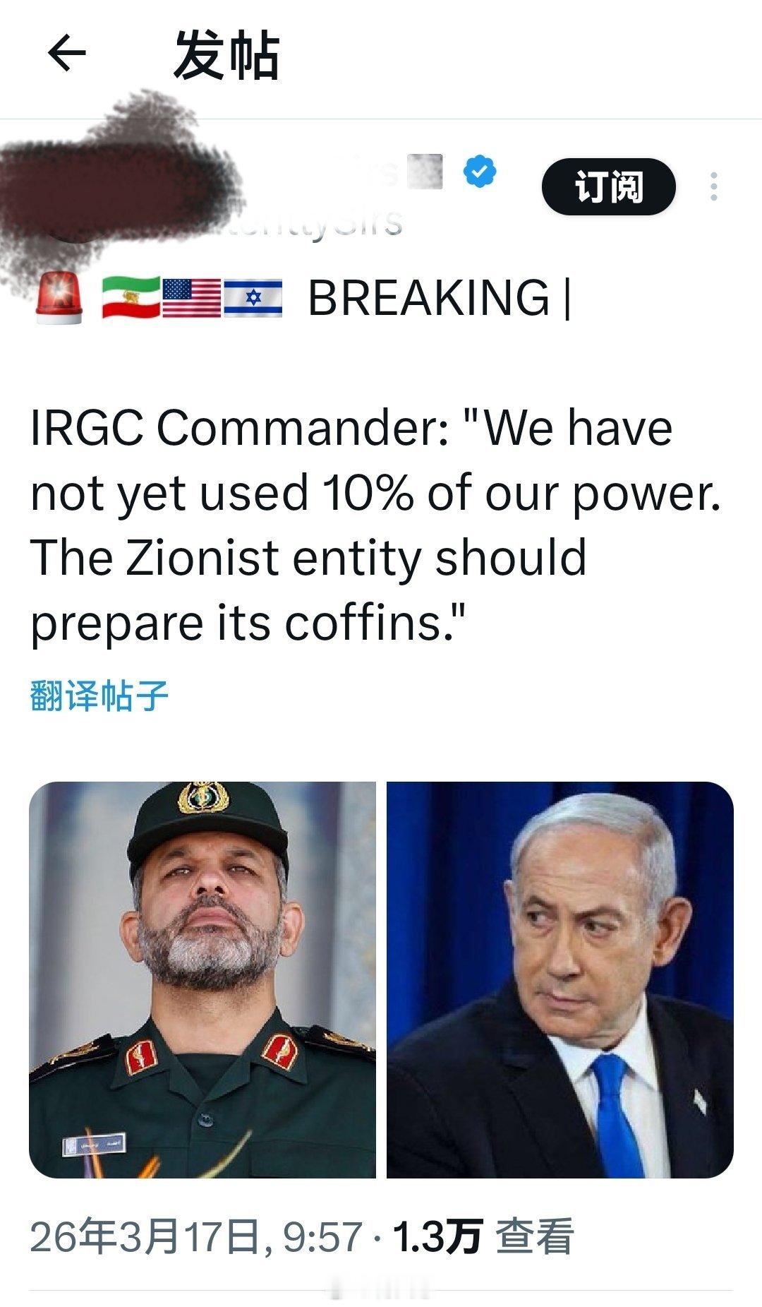 紧急消息 | 伊斯兰革命卫队指挥官:“我们尚未动用 10%的力量。犹太复国主义实