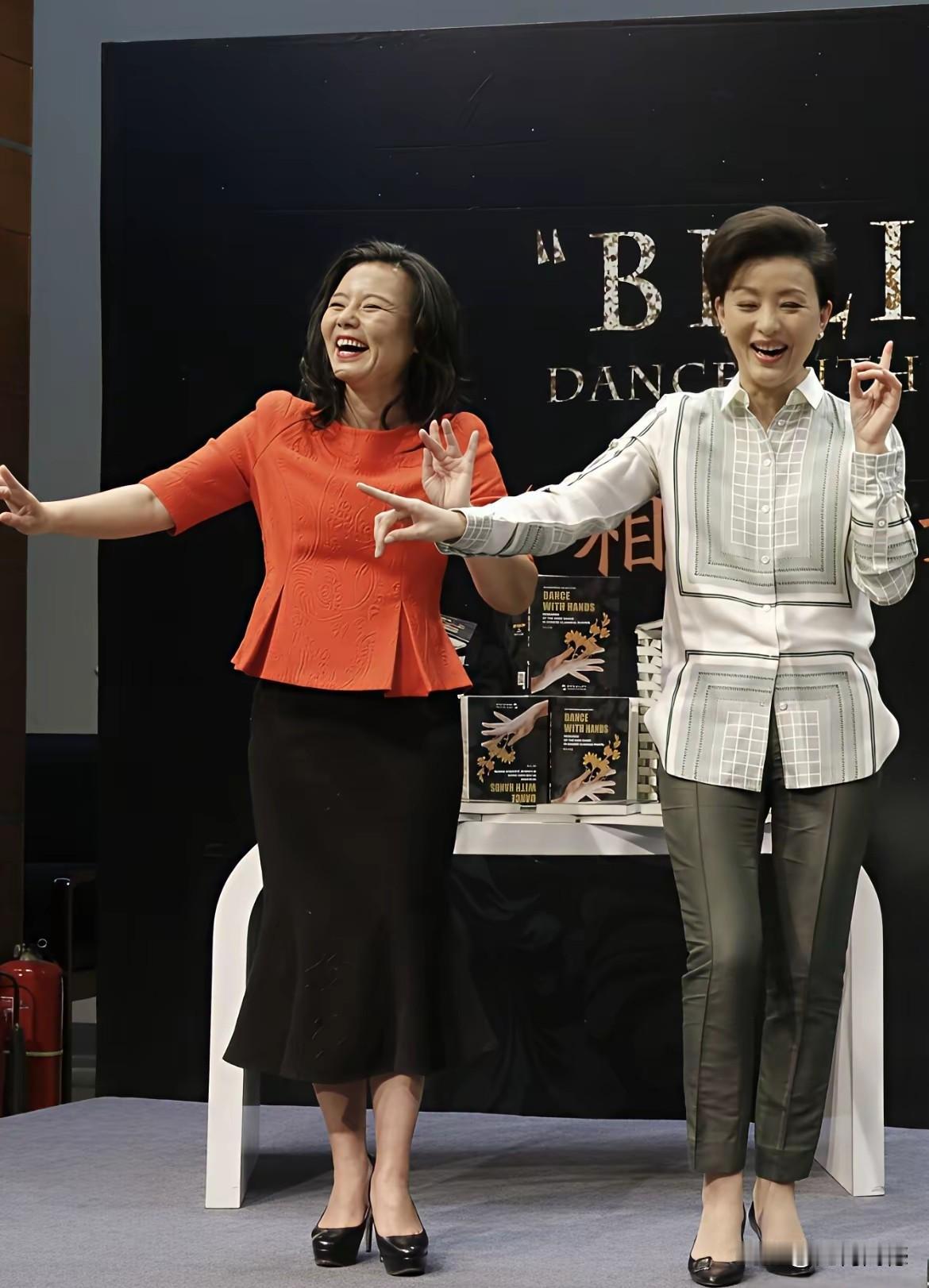 杨澜和这个女子在做什么?感觉两个人是在唱京戏,并不像是在跳舞,尤其是看杨澜的表情,虽然是在笑,但是笑的有些腼腆,不知道这张照片是什么时候拍摄的,感觉不应该是近期的,应该是以前的老照片,因为那时候身材还比较消瘦,现在明显比以前富太多了!