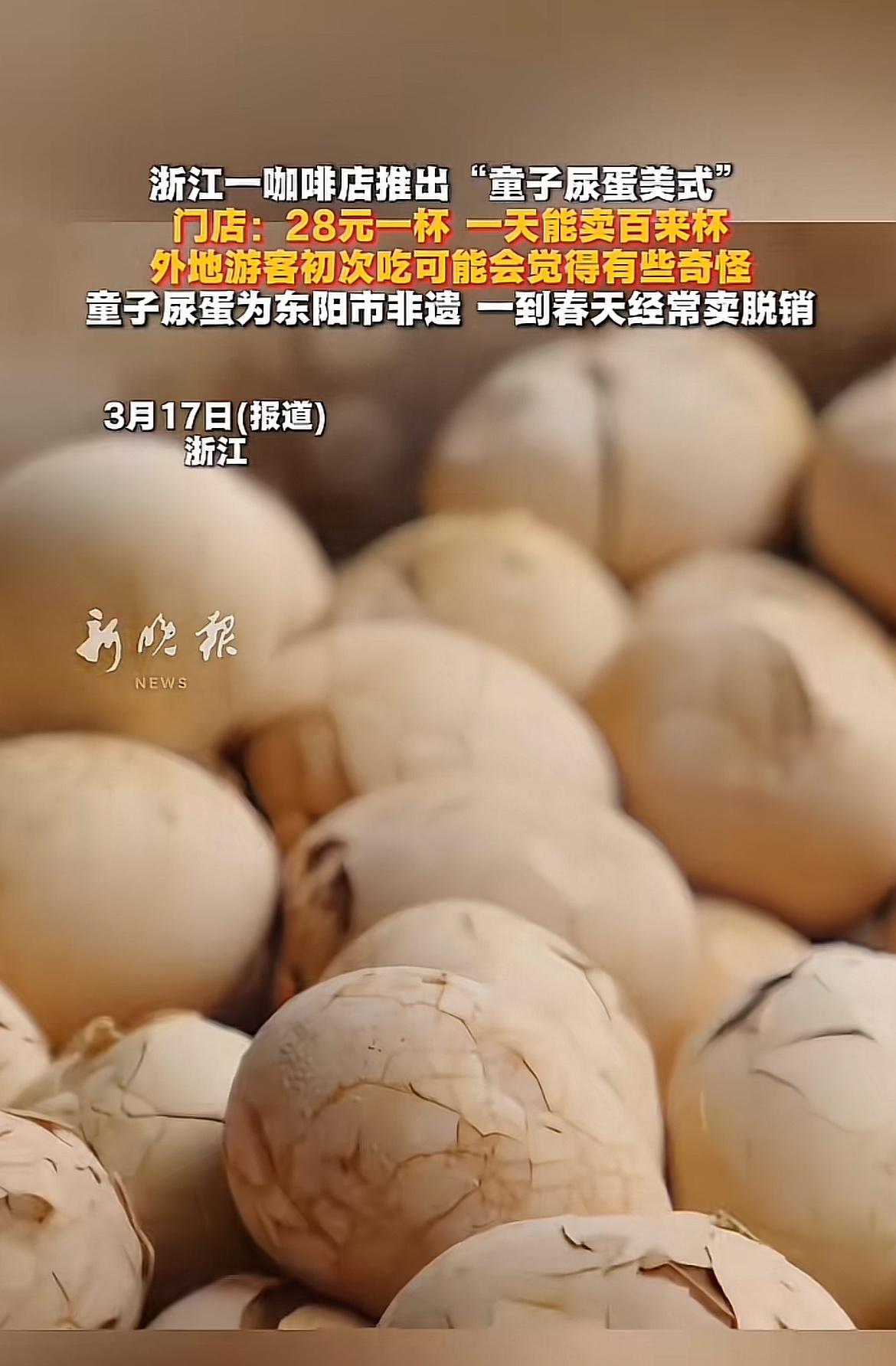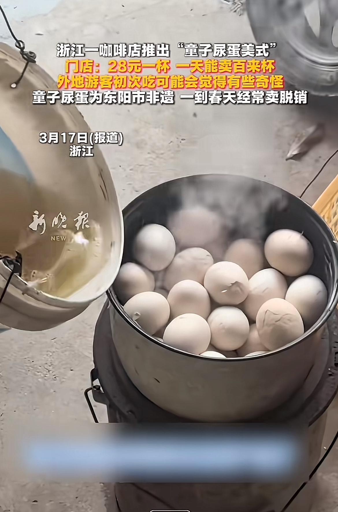 浙江东阳一家咖啡店把童子尿蛋和美式咖啡结合,推出“童子尿蛋美式”,28元一杯,一天能卖百来杯,还有外地人慕名来尝。童子尿蛋是用10岁以下男童小便煮的鸡蛋,是东阳非物质文化遗产,传统认为有滋阴降火等功效。 这童子尿蛋煮好后经炭火烘烤,表皮略焦,口感焦咸。有人会把蛋碾碎放咖啡里喝。此外,店里还有梅干菜芝士拿铁。有人觉得这是创新,有人觉得毁三观,有人为猎奇买单,有人为情怀买单。只能说萝卜青菜各有所爱,不理解可以尊重,不接受也别嘲讽。这28元一杯的“童子尿蛋咖啡”,你会去尝鲜吗?