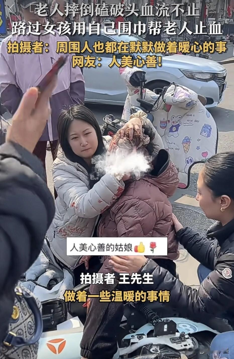 近日,北京一位大妈骑电动车时不慎摔倒了,由于没有佩戴头盔,大妈头部被磕破了血流不止!她无助的躺在那里,身体不敢动弹! 这时,一位身穿浅白色羽绒服的女孩恰好路过,看到大妈头部流了很多血后,她毫不犹豫的把大妈扶了起来,然后把自己戴的围巾摘了下来,缠在了大妈头上为她止血! 女孩担心大妈倒了,便把她护在了身前,可以看到她的羽绒服上也沾了很多血渍,但她并没有嫌弃,反而一直护着大妈,直到救护车赶来! 期间,路过的其他一些好心人也伸出了援助之手,一位大哥帮忙紧急拨打了120急救;还有一位大姐贴心的扶着大妈后背,生怕她仰倒! 这位女孩不但人美,心地更是善良淳朴,她没有考虑“扶不扶”的问题,第一时间想到的就是先救人,为她的善举点赞,也为其他仗义出手的路人点赞,希望这份爱心能够传递下去!