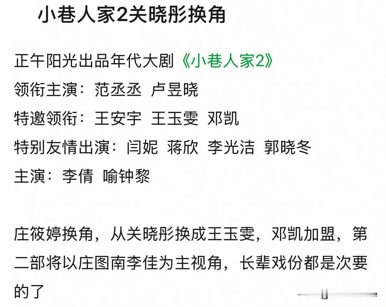 3月17日,《小巷人家2》关晓彤换角 庄筱婷从关晓彤换成王玉雯,第二部将以范丞丞卢昱晓为主,长辈戏份都变次要了 讲真与其庄筱婷从关晓彤换成王玉雯,不如索性找个借口说庄筱婷去山区支教了,王玉雯加入很突兀,王玉雯粉丝也不想王玉雯饰演这个挂件角色,没什么戏份不说,还容易被拉出来跟关晓彤对比,惹争议 个人觉得也是,另外,长辈戏份其实是小巷人家的一大看点,还有几个小孩小时候的戏份,他们五个年轻演员的戏份其实不算特别出彩,如果这么改,不如换个名字,换部剧,把小巷人家这份美好留给观众!