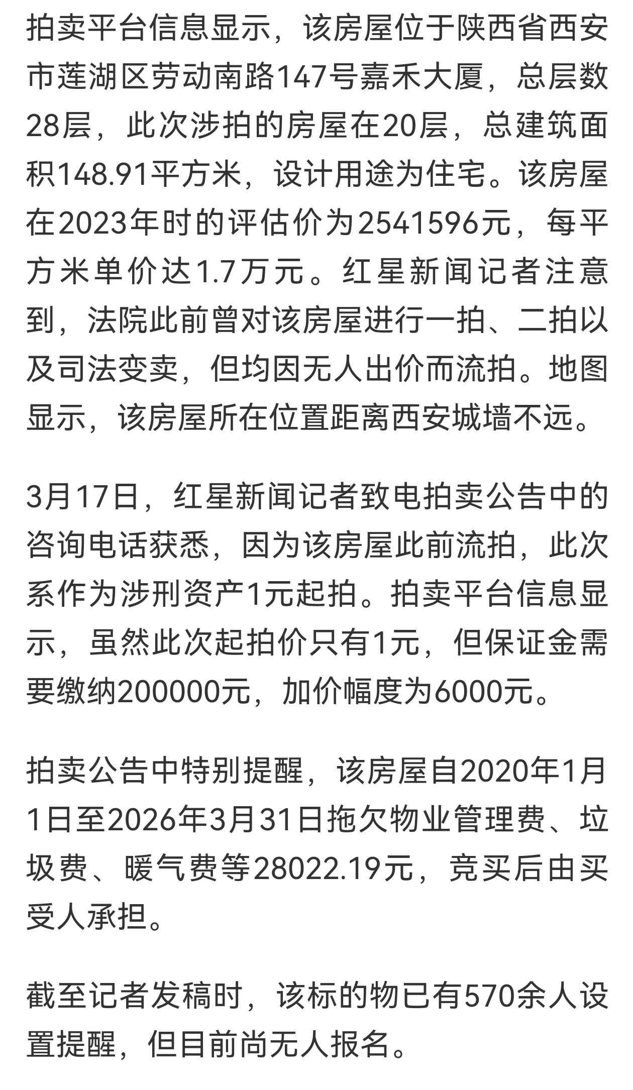 看似1元起拍,实则是很多法拍房的拍卖套路,目的是为了吸引更多人竞拍,最终成交价往往接近市场价,但法拍房存在很多不可预知的风险,哪怕竞赛者运气好,拍到了低于市场价的房子,但后续若有欠债、产权争议,都是糟心事,这也是法拍房越来越无人问津的原因。西安一148平方米住宅将1元起拍时事满谈