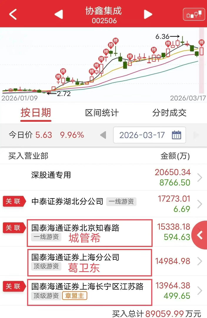 盘后龙虎榜显示,章盟主买入1.39个亿,葛卫东买入1.49亿,城管希买入1.7亿。