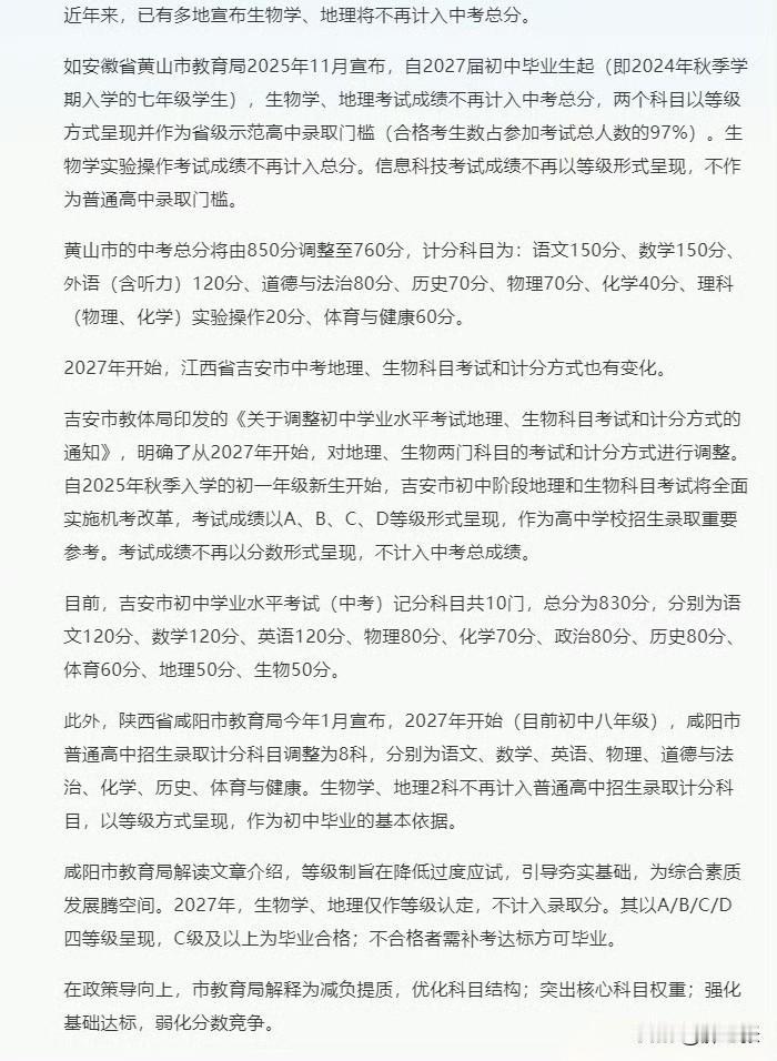关于教育减负部分地区将在2027年起将生物、地理不再计入中考总分的消息,对我们普通人到底是好是坏呢? 在我印象中“生物和地理”的考点基本属于死记硬背一类,现在将它们移出中考计分短时间来看应该是好事,最起码中考学子不用花大量时间去记去背了。 但是有好的一面肯定也会有不好的一面,初中没有学好的这两科,到了高中时可能就要用更多的时间去填补知识断层了! 还有一个层面的考虑,就是可能在学校没学到的知识,如果在家庭中也学不到,可能学生的认知和两极分化会更加鲜明! 这一点差距可能在上高中以后会越来越明显,尤其是和家庭教育环境更加优渥的孩子相比! 其实我还有一个想法,是谁在制定这些减负的实施办法?为什么不取消英语?“地理、生物、历史”这些课程为什么比不过英语呢?