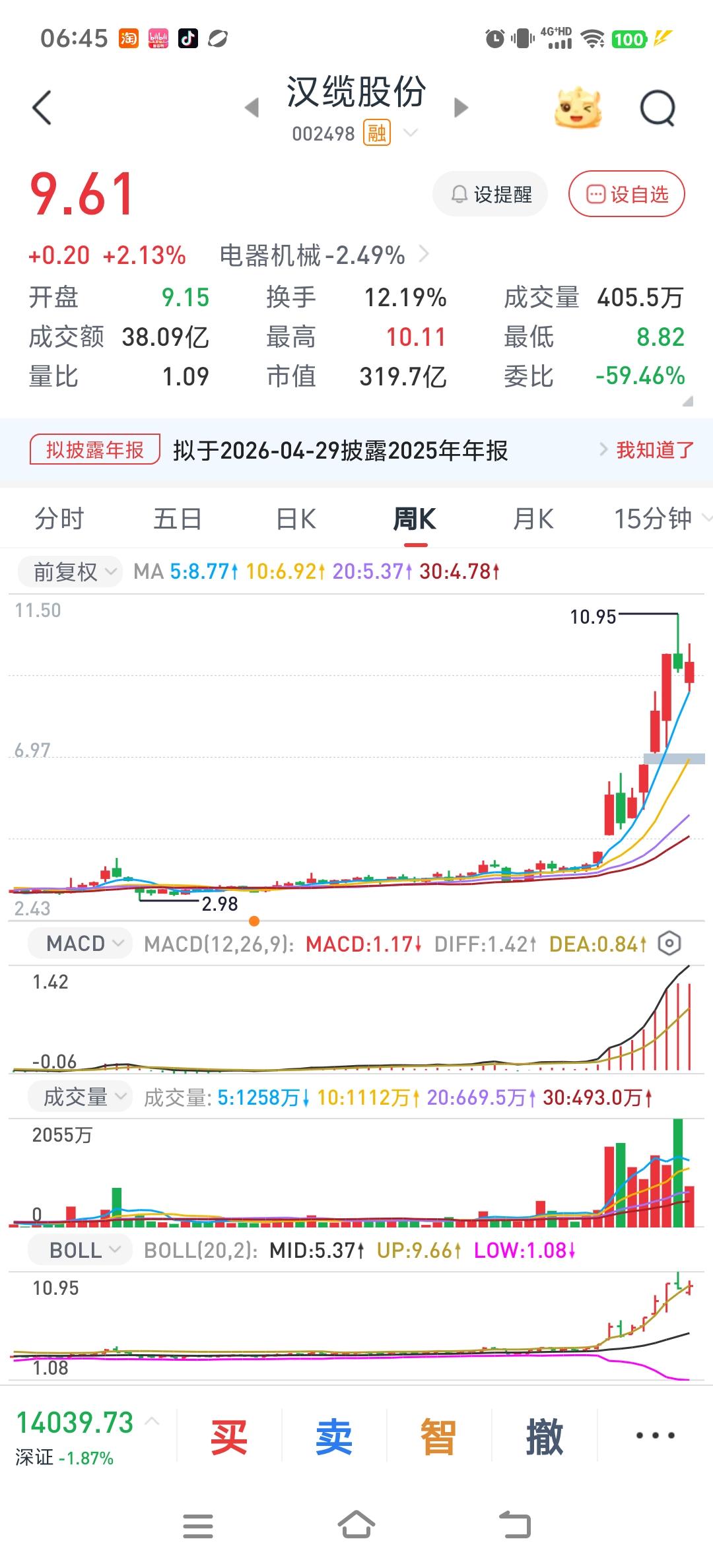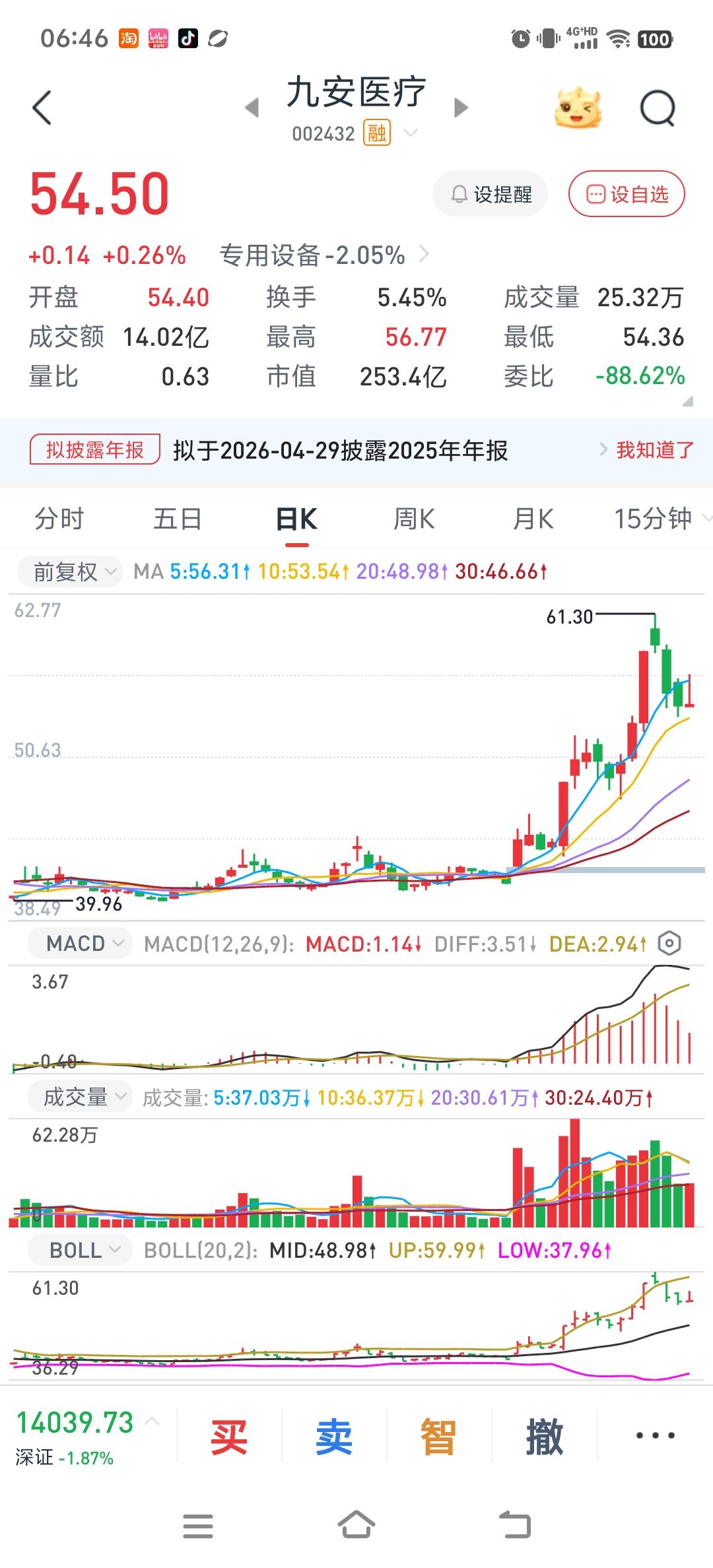两根K线决定后面中期走势,大道至简,还是控制风险,守住本金。 昨天的走势很多人接受不了,大跌,个股反复破位,散户亏损严重,今年损失惨重,能够赚钱的人不多了。 其实,我今年开始写文章那一天,一月19日那个K线就是转折点,是阶段性头部的标志,那个时候,只是我的感觉,感觉大盘不好,让周围人空仓,股票都获利了结。现在回头看看,已经验证了,虽然大盘指数下跌不多,但是,很多股票下来二十多个点了。 另外一个重要的K线,是3月3日的K线,那个大阴线,宣告,大盘正式往下走,破位下行,开始调整,在后面日子里,一直没有上去,一直都是在阴线下面运作。 这样也是表明了,后面的操作,还是要控制风险,绝大部分股票破位了,要么及时止损,要么持币观望,有能力的人,做强势股票,但是那个难度很大。 还是那句话,用时间换取空间,二三四月份空仓观望,五月份如果有机会,把握一次结构性行情,一年下来,不要天天做股票,把握两次大的机会足以。 今天要止跌回稳,可能不是好的买点,休息还是休息。