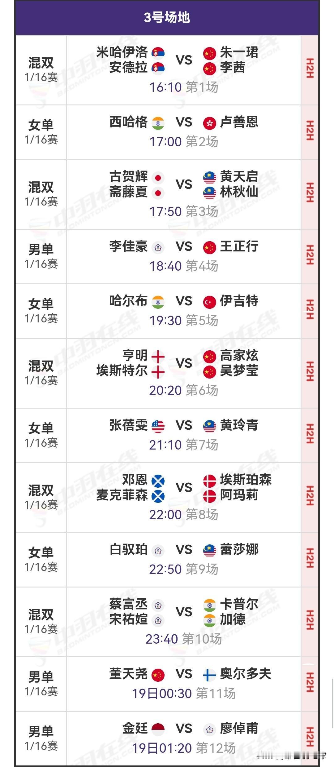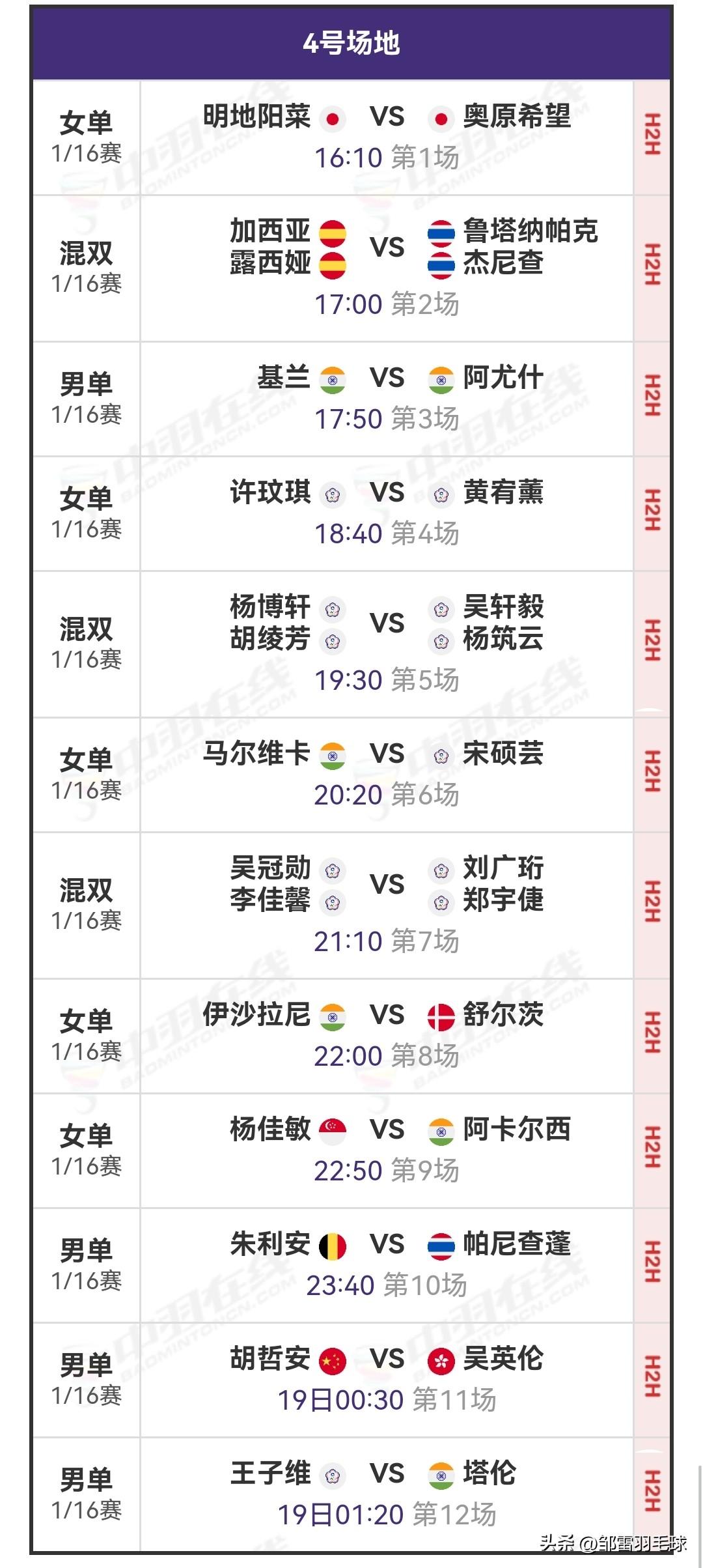 3月18日奥尔良羽毛球大师赛1/16决赛(二)赛程安排 昨日,国羽选手在赛场上全线告捷。特别是几位小将,在两轮资格赛中表现极为出色。董天尧直落两局击败李梓嘉,朱轩辰两局横扫古贺穗,胡哲安同样以两局的优势战胜大林拓真,他们都成功闯入今日的正赛。 今日北京时间16:00起,1/16决赛(二)将正式打响。参赛选手包括王正行对阵李佳豪、朱轩辰对阵大波波夫、胡哲安对阵吴英伦。详细对阵安排如图所示。 羽毛球 羽毛球爱好者 羽毛球比赛 羽毛球都有什么品牌 羽毛球赛事 国羽 胡哲安 国羽加油
