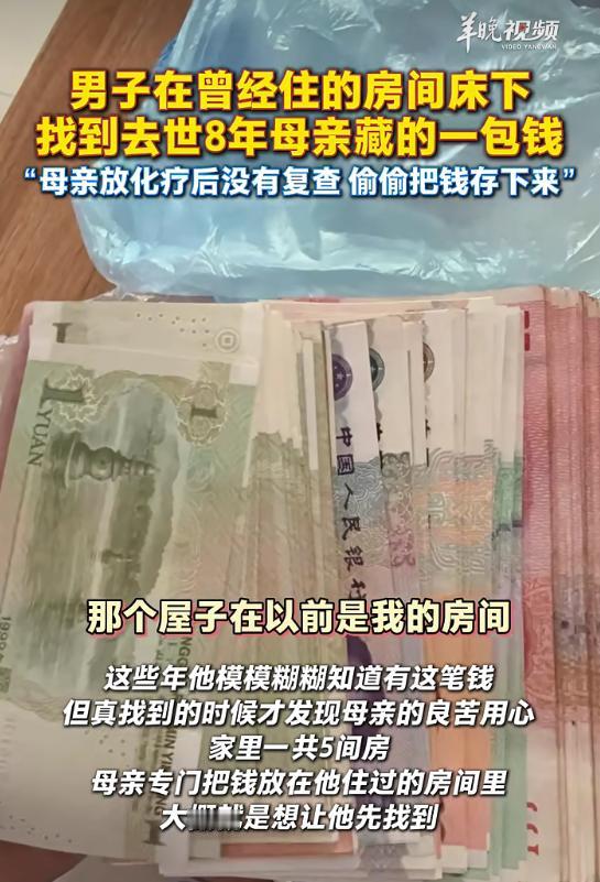 男子在旧居床下找到去世8年母亲藏的一包钱:很心酸,母亲患癌放化疗后没有复查,偷偷把钱存下来;网友:这是妈妈留给你最后的爱! 近日,河南一位男子在自己曾经住过的房间床下找到了一包钱,竟然是去世8年的母亲生前藏起来的。 男子说母亲当年得了癌症,放化疗后没有复查,而是偷偷把钱存了下来。 这些年他模模糊糊知道有这笔钱,但真找到的时候才发现母亲的良苦用心。家里一共5间房,母亲专门把钱放在他住过的房间里,大概就是想让他先找到。 网友:这是妈妈留给你最后的爱! (起点新闻、钱江晚报)