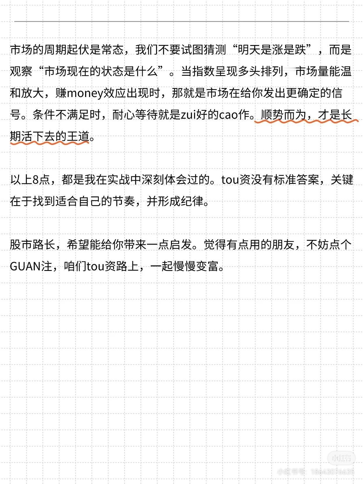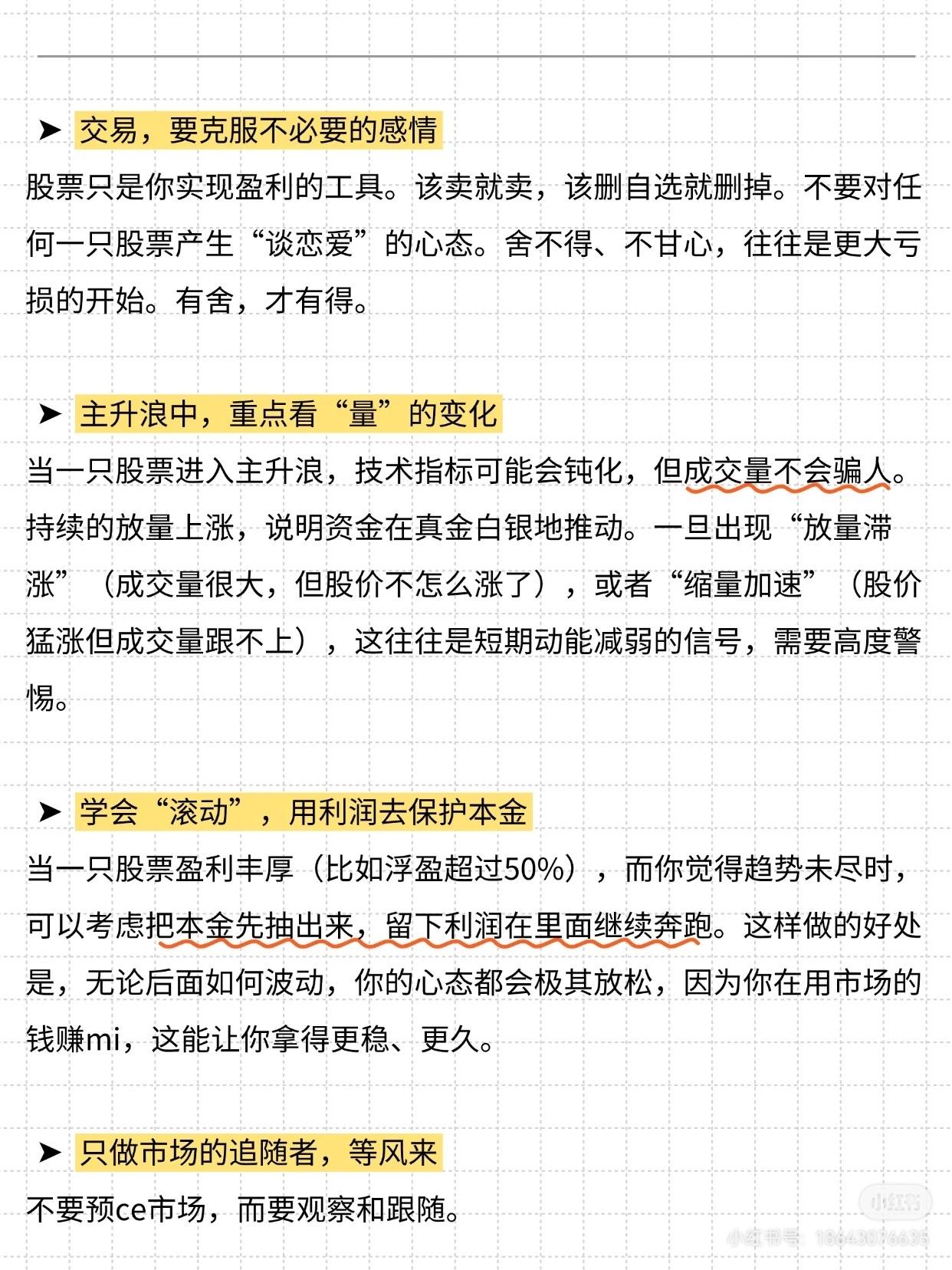 分享炒股8大不变真理: 1. 短线可追高但慎抄底,跟强势股龙头,勿接下跌飞刀; 2. 大利润来自专注主线龙头,吃透波段; 3. 炒股本质是跟随趋势,以20日均线为多空分界; 4. 拉黑5类股(下降趋势、分时死水、三无、造假、长期低迷无活性); 5. 交易克服感情,不对股票“谈恋爱”; 6. 主升浪看量,放量滞涨或缩量加速需警惕; 7. 盈利丰厚时滚动操作,抽本金留利润; 8. 只做市场追随者,顺势而为,耐心等信号。投资无标准答案,需找自身节奏并守纪律。