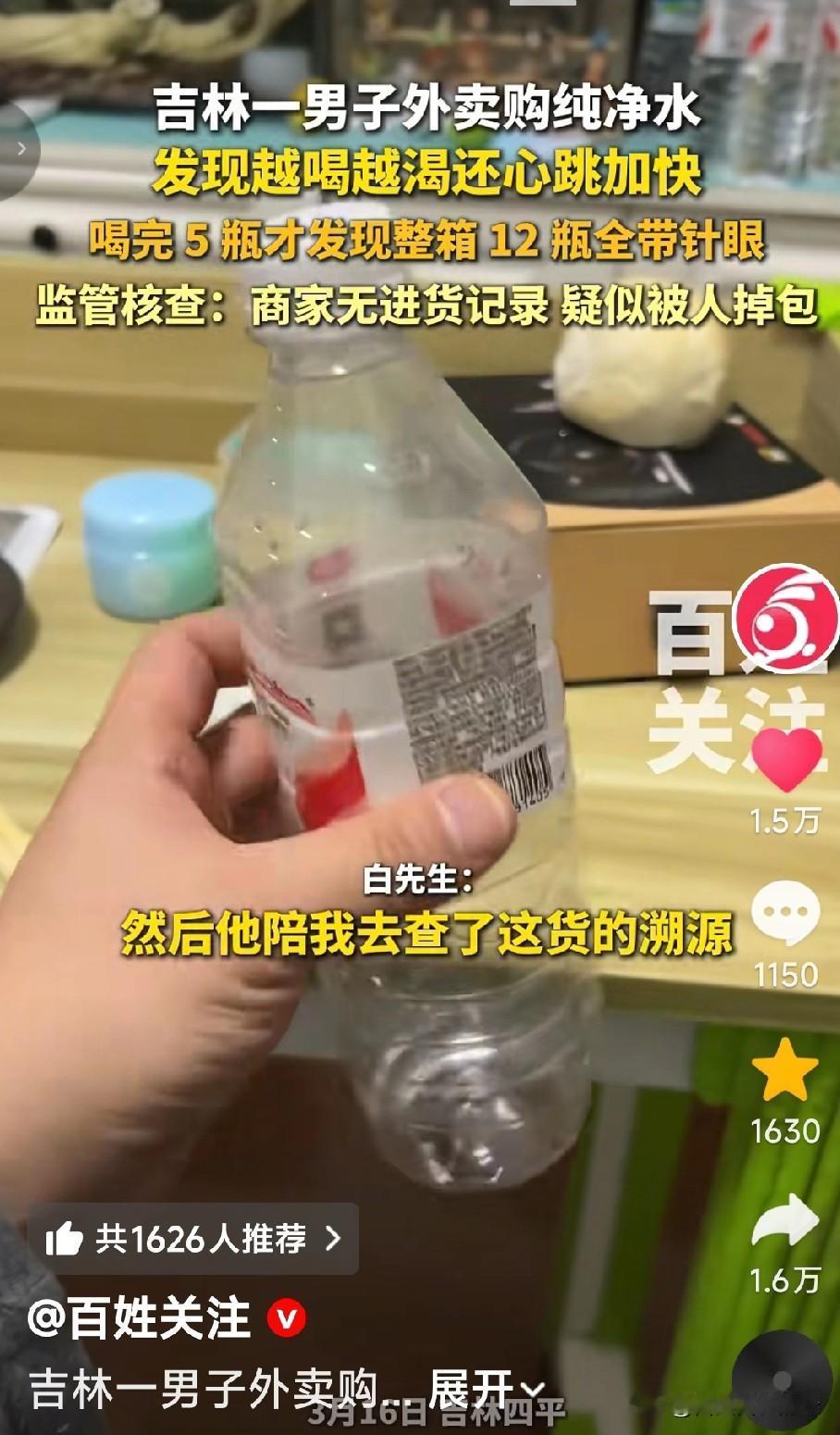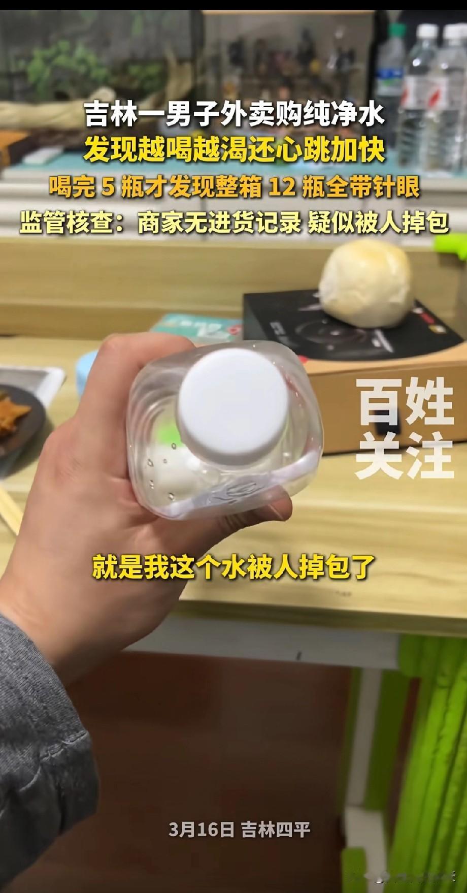 好可怕!吉林四平,一男子在某平台购买了一箱纯净水,他和朋友喝了5瓶后,才发现瓶盖上被人扎了针眼。一共12瓶水,每个上都有针眼。 男子说,水送来后,他一口气喝了两瓶半水,可是却越喝越渴。喝完还口干、心跳加速的感觉,朋友也喝了两瓶,也有这种感觉。 他们觉得不对劲,就拿起未开封的水检查,结果发现每瓶水的瓶盖上都被扎了针眼。 男子觉得挺后怕的,万一水里被人放了不明物体,会不会对他们的身体造成伤害。他赶紧把这件事反映到了当地的食品药品监督局,工作人员带他查了水的来源,结果发现商家根本没有进他这箱水,批号对不上。 也就是说他这箱水被人调包了。 现在男子说,市场监督局还在查水的来源,但是他们当地还无法检测水到底有没有毒,所以水样给他们留在那里了,还在等待检测结果。 我觉得男子和朋友还是先去医院做个检查吧,毕竟喝了来路不明的水,还是挺吓人的,万一被人投放了什么毒物,就麻烦了。 我觉得男子也应该报警,万一是熟人作案,故意陷害你呢。 有网友说,也有可能是回收的瓶子,有人用来二次使用。 说实话如果是这样,反倒好点,至少没有毒。就怕有人恶意投毒,那就危险了。所以在这里给大家提个醒,喝外人给的水,或者买来的水时,一定要检查一下再喝,小心谨慎点没坏处。 对于这件事,你怎么看呢?