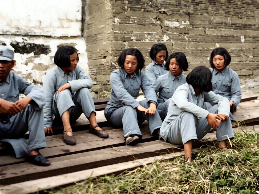 抗日战争时期,几名不幸被侵华日军俘获的年轻女战士。她们的神情没有惊慌失措,流露出的是不甘和落入敌手的无奈。 旁边男子的军帽上只有两粒扣子,并没有青天白日徽章,推测这些被俘的都是八路军,这也注定他们会以坚贞不屈的态度迎接未知的命运。