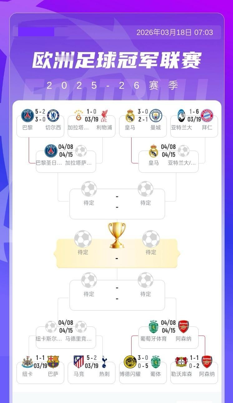 欧冠8强确定4席:阿森纳、皇家马德里、巴黎圣日耳曼、葡萄牙体育 3月18日 ,本赛季欧冠8强率先确定4个席位:阿森纳、皇家马德里、巴黎圣日耳曼、葡萄牙体育 具体赛况如下: 皇马客场2-1战胜十人曼城,总比分皇马5-1双杀曼城晋级欧冠八强 巴黎3-0击败切尔西,巴黎两回合总比分8-2淘汰切尔西,晋级八强 阿森纳2-0总比分3-1勒沃库森晋级八强将对阵葡萄牙体育 葡萄牙体育5-0击败博德闪耀,两回合总比分5-3上演惊天大逆转,晋级欧冠8强