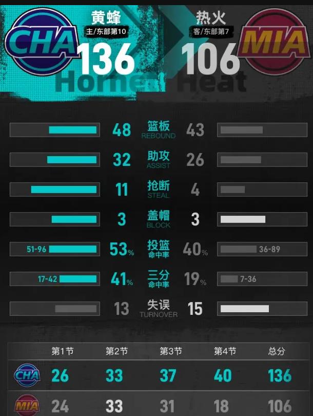黄蜂这136-106,看似是"青春风暴"席卷,实则是把热火的"强硬"人设摁在地上摩擦! 末节40-18,直接打崩。前三节还咬得紧,第四节热火跟断电了一样,怎么?老年机电池不行了? 好家伙,拉梅洛·鲍尔这30分13助攻,不是在传球,是在给全队"喂兴奋剂"!转换进攻那四分卫长传,no-look pass,比赛节奏直接提两档。更关键的是,第四节初段他连得7分,亲手拉开那波18-6的死亡攻击波。这核心后卫的带动能力,数据表装不下。 若您细看,这球赢得邪门。热火缺了阿德巴约和维金斯,希罗带队,确实硬实力打折。但黄蜂这末节风暴,真不是偶然——鲍尔、米勒、克尼佩尔、布里奇斯、怀特,五个能处理球能投篮的同时在场,热火那套铁血防守直接被"乱枪打鸟"冲得七零八落。这就是现代篮球的密码:极致空间和速度,专治各种铁桶阵。 治愈在哪儿?在这支黄蜂终于学会怎么"杀死比赛"。 过去他们年轻气盛但收不住,这回末节那口气没松,米勒连续三分,克尼佩尔跟进,布里奇斯兜底,全员提速无限换防。这不是天赋碾压,是执行力的质变。 热火输得不冤,缺兵少将,体能瓶颈到了。但这也给东部提个醒:光有强硬不够了,得跟上这班年轻人的狂飙速度。黄蜂这34胜34负,刚好五成,他们不是来摆烂的,是来搅局的。这30分大胜,是信心,也是宣言——青春不讲武德,但真香!鲍尔30+13希罗20分 黄蜂狂胜热火