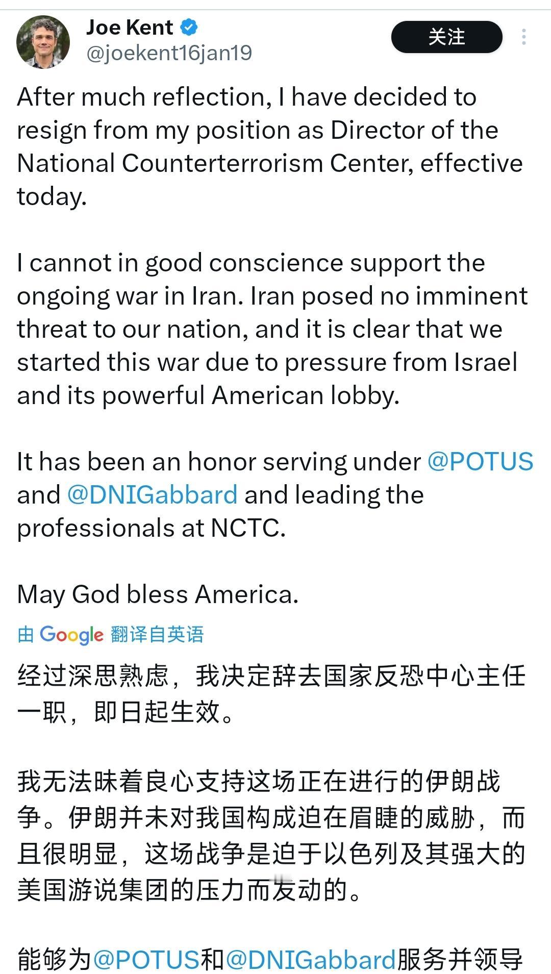 3月18日,特朗普所任命的国家反恐中心乔·肯特(Joe Kent)在个人的社交媒体上宣布辞职,并且配上了一封很长的辞职信,强调与特朗普在对伊朗战争问题上的观点分歧。这是否意味着特朗普周边的核心圈层MAGA派,对于本轮美以伊冲突,开始出现了内部分裂呢?这对于未来的战局发展又将产生什么样的影响呢? 首先,从美国反恐中心主任肯特的背景来看,他是典型的美国军事与情报精英:出生于1980年,20年军旅生涯中作为绿贝雷特特种部队成员完成11次中东作战部署,2018年退役后转任中央情报局准军事官员,曾多次参与反恐行动。他是特朗普长期支持者和MAGA派代表人物,曾两次竞选华盛顿州国会席位,2025年2月获特朗普提名并于同年7月正式出任国家反恐中心主任,同时担任国家情报总监图尔西·加巴德的幕僚长。 其次,他这一次辞职的主要原因还是强烈反对特朗普政府发动的对伊朗战争。他在公开的辞职信中明确表示:“我无法在良心上支持对于伊朗的这场战争。伊朗并未对我国构成迫在眉睫的威胁,这场战争显然是受以色列及其强大美国游说集团的压力而启动。”他强调自己曾与特朗普都反对陷入中东战争“泥潭”,但如今无法支持将美国人送上“无益于国家利益”的战场。 第三,这一事件的重要性在于,它反映出特朗普内阁内部、尤其是MAGA阵营开始出现明显分裂迹象。肯特作为特朗普最忠诚的铁杆支持者和情报高层,却公开指责战争源于“以色列游说”而非美国利益,这打破了MAGA内部长期强调的对特朗普绝对忠诚的传统。此前特朗普政府在伊朗问题上保持高度一致,但肯特的辞职成为首位高级官员因政策分歧公开出走,可能会进一步引发MAGA内部“美国优先派”和“亲以色列派”的对立。国家情报总监加巴德虽迅速表态支持特朗普判断,但参议员泰德·克鲁兹等人士认可辞职“正确”。这标志着特朗普第二任期内阁从团结转向潜在内耗,尤其在外交安全领域,MAGA的“反战反干预”核心理念与美以盟友压力之间裂痕初现,可能进一步波及国会或基层支持者。 最后,肯特辞职对伊朗战局未来的走向将产生一定影响。 作为反恐情报核心机构的负责人,其出走削弱了政府内部情报协调与反恐策略的统一性,可能导致国家反恐中心在评估伊朗威胁、监控代理人网络时的效率下降,进而影响战场决策的精准度。目前美以对伊朗的军事行动已进入第三周,肯特公开质疑“无迫在眉睫威胁”和“以色列误导”,将放大国内反战声音,并可能促使更多温和派或情报官员跟进质疑,增加特朗普政府维持长期作战的政治成本。 从战局趋势看,这可能会加速美方的政策转向——缩短冲突周期、避免地面战泥潭,或被迫与伊朗谈判止损;但短期内也可能刺激伊朗及其盟友加大反击力度。长远而言,若内部分裂加剧,战局或滑向消耗战,最终迫使特朗普回归其早期“避免陷入中东泥潭”的美国优先路线。