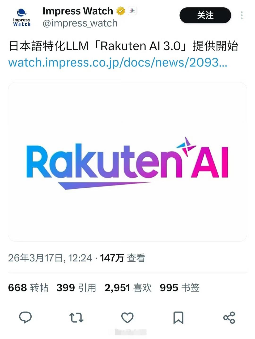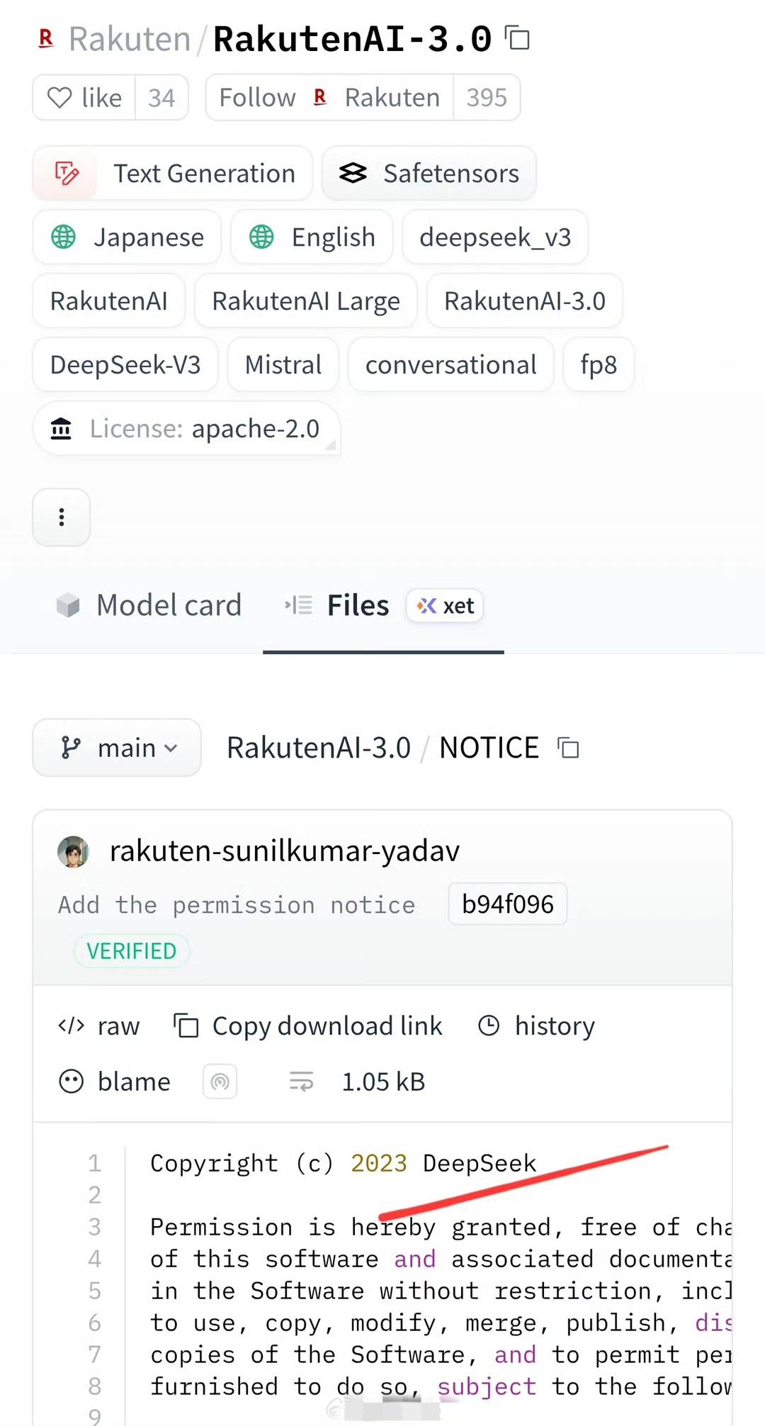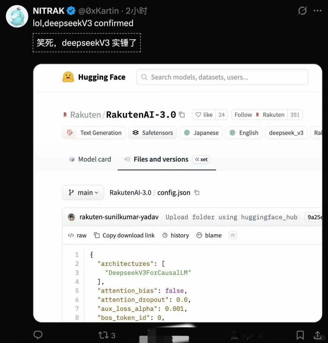号称是日本最高性能人工智能大模型乐天AI 3.0,结果被发现是套壳 DeepSeek… 乐天AI 3.0被社区网民扒出是基于中国的DeepSeekV3架构后,乐天悄悄删除了deepseek相关许可证,暗示其为自研大模型。这厚颜无耻的一幕,让日本网民惊呆了… 不过也不惊讶,韩国前几个月爆出过一模一样的事,韩国官方搞的AI模型比赛,第一名发现是基于中国AI,结果第一名退赛后,第二三名被爆料也是用的中国AI。 只不过不是基于DeepSeek,而是基于Qwen…[允悲]ai开发模型 AI模型测评 AI国产大模型