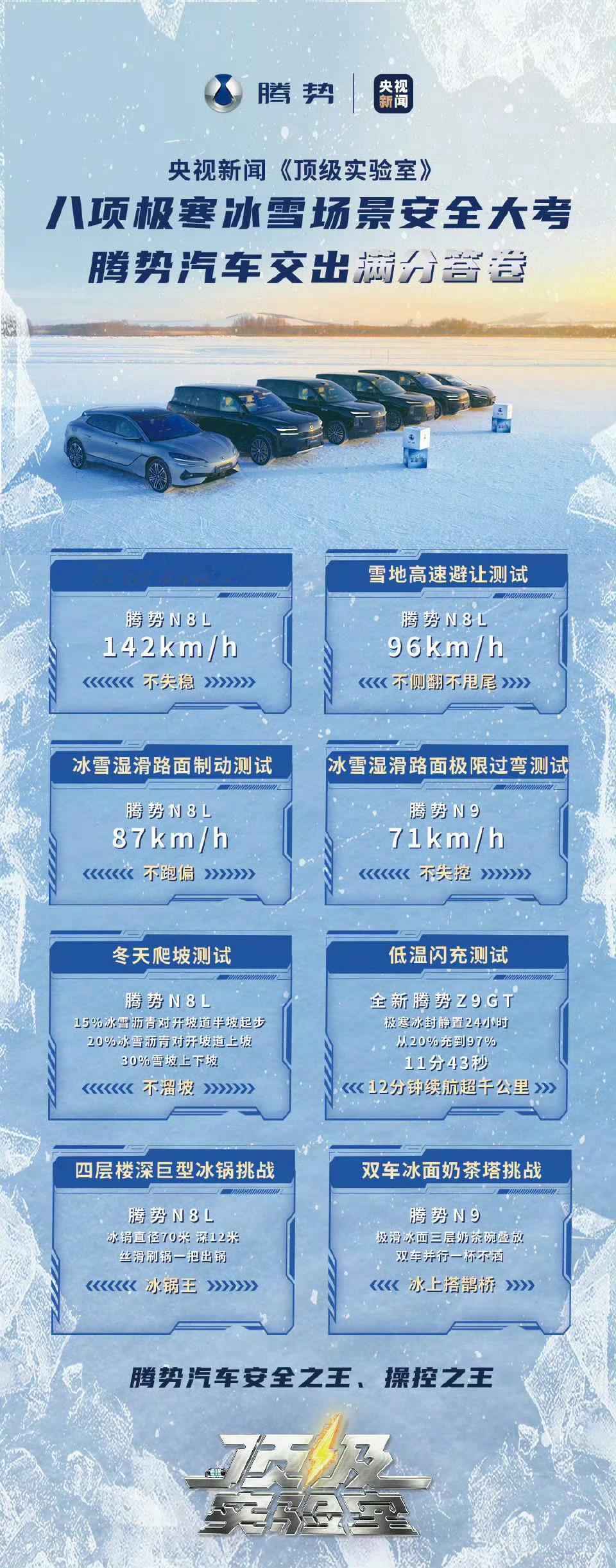 央视新闻实测腾势极寒闪充 这次比亚迪闪充技术也让央视关注到了,这次央视新闻《顶级实验室》直接拉比亚迪到零下30℃极寒考场,对腾势开启八项冰雪全场景严苛大考。在比亚迪硬核技术的加持下,腾势这个“安全之王”“操控之王”全都轻松通关。腾势Z9GT冰封静置24小时,12分钟充至97%,也印证了极寒情况下闪充同样毫无压力。腾势N8L以142km/h创全球最高雪地高速爆胎稳定控制速度,96km/h雪地避让不侧翻不甩尾,实力震撼全场。这次比亚迪真的让人刮目相看极端场景少见,安全冗余拉满,腾势用硬核黑科技,守护每一次安心出行。腾势汽车安全之王
