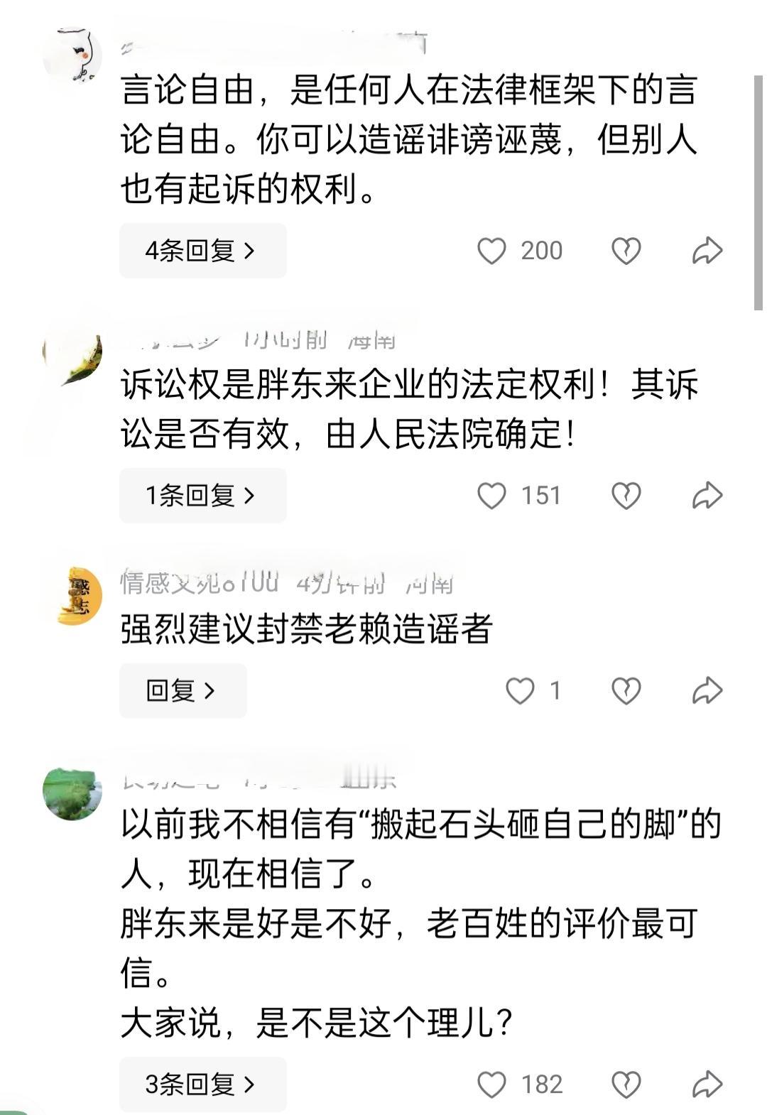 宋清辉败诉以后,一直很不服,到处在网上抱怨,如果你是对的,怎么会败诉呢?胖东来如果是滥用诉讼打压言论,为什么没人制止呢? 看一下评论区就知道咋回事儿了: 网友甲:言论自由,是任何人在法律框架下的言论自由。你可以造谣诽谤诬蔑,但别人也有起诉的权利。 网友乙:诉讼权是胖东来企业的法定权利!其诉讼是否有效,由人民法院确定! 网友丙:强烈建议封禁老赖造谣者 网友丁:以前我不相信有“搬起石头砸自己的脚”的人,现在相信了。 胖东来是好是不好,老百姓的评价最可信。 大家说,是不是这个理儿? 继续往下看,大同小异,谁对谁错,还用说吗? 经济学家宋清辉