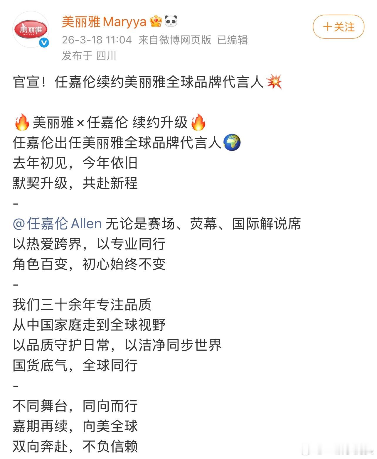 官宣任嘉伦和美丽雅续约并升级为全球品牌代言人!全新身份和品牌携手共进任嘉伦代言续约率真的不是盖的!嘉人姐姐实力超群👏