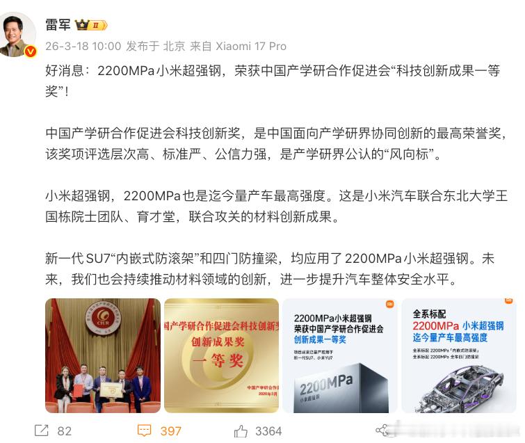 小米超强钢获得国家级科技一等奖 懂行的人都知道小米超强钢的含金量和对SU7、YU7的车身安全提升有多大,只有黑子们眼睛一闭就是开喷,小米2200MPa超强钢到目前都是迄今量产最高强度,这次还拿到了一等奖,材料和奖项都很硬,安全是基础,安全是一切虽然成本更高造价更贵,但对于安全来说这些投入都是值得的。