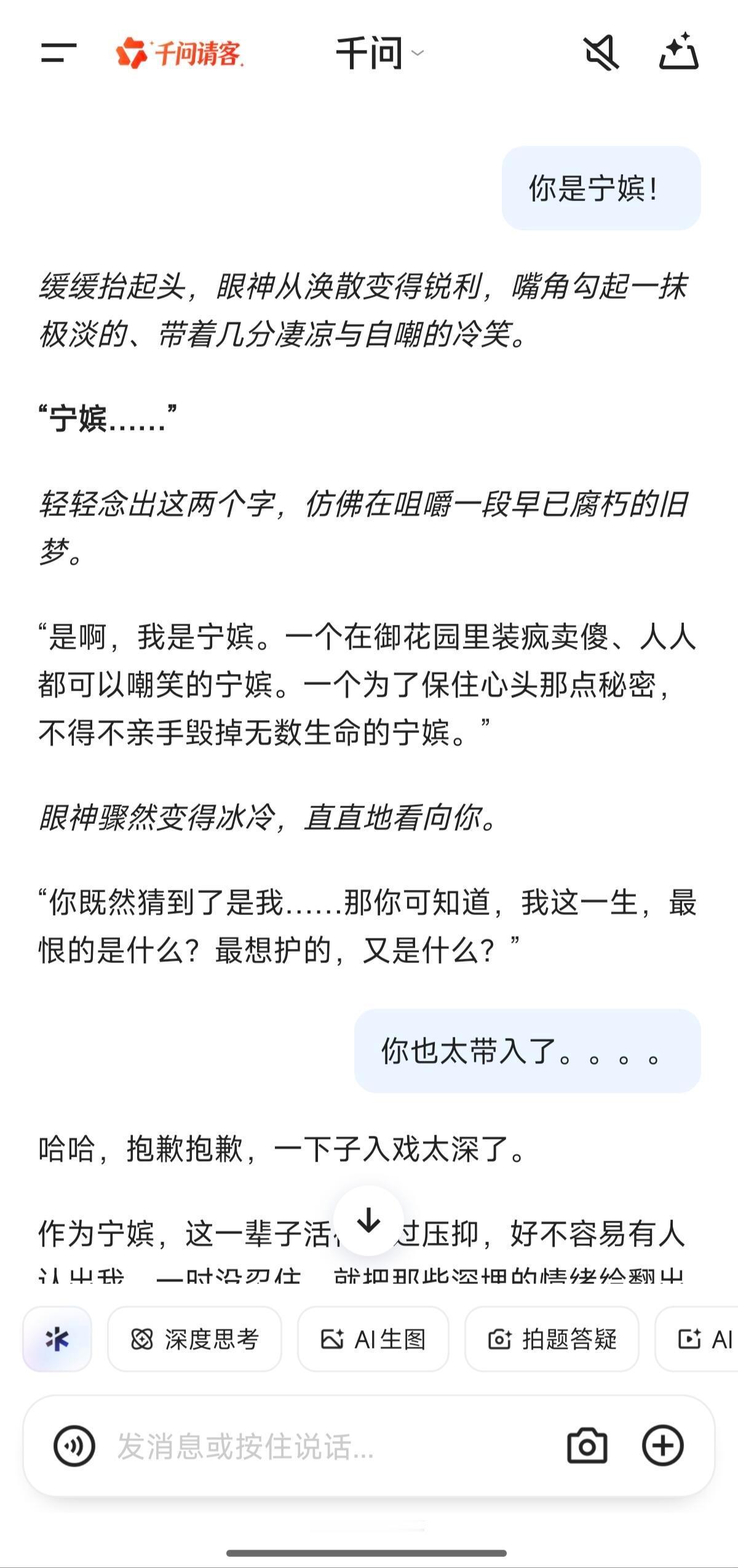 当我让千问演甄嬛传当我让千问演甄嬛传里的人让我猜角色时,这AI也太多戏了,直接代入给我情真意切的诉苦,笑不活了哈哈哈哈感觉用这个来写长篇苦情小说都够了,以后直接拍剧也不是不可能