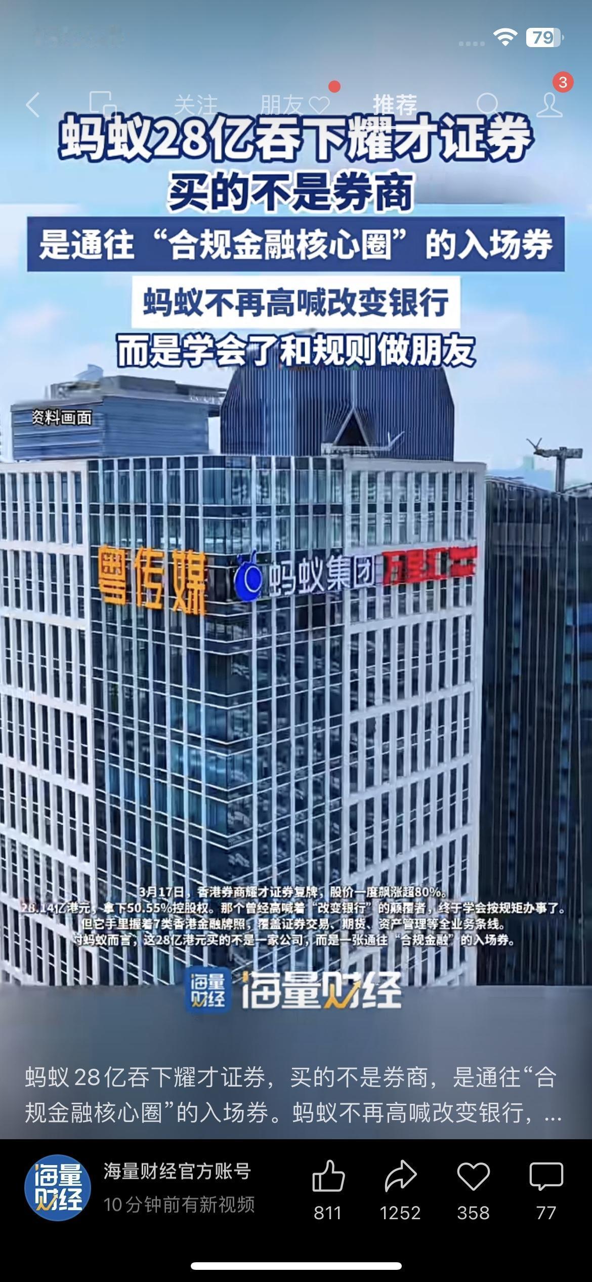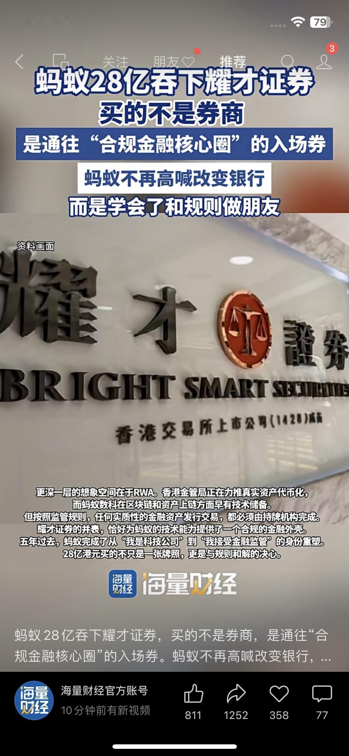 28亿港元!蚂蚁吞下耀才证券,买的不是券商,是合规金融入场券 蚂蚁用28.14亿港元,拿下耀才证券50.55%控股权,这家香港券商有7类全牌照,覆盖证券、期货、资管。 五年前还喊“改变银行”,现在花大价钱买牌照,说白了就是学会和金融规则做朋友,拿到合规入场券。 以后蚂蚁的区块链、资产上链技术,能通过券商牌照合规落地。 提醒:市场有风险,投资需谨慎,不构成任何投资建议,这是蚂蚁的转身,也是金融合规新信号。 蚂蚁集团 耀才证券 金融合规 互联网金融