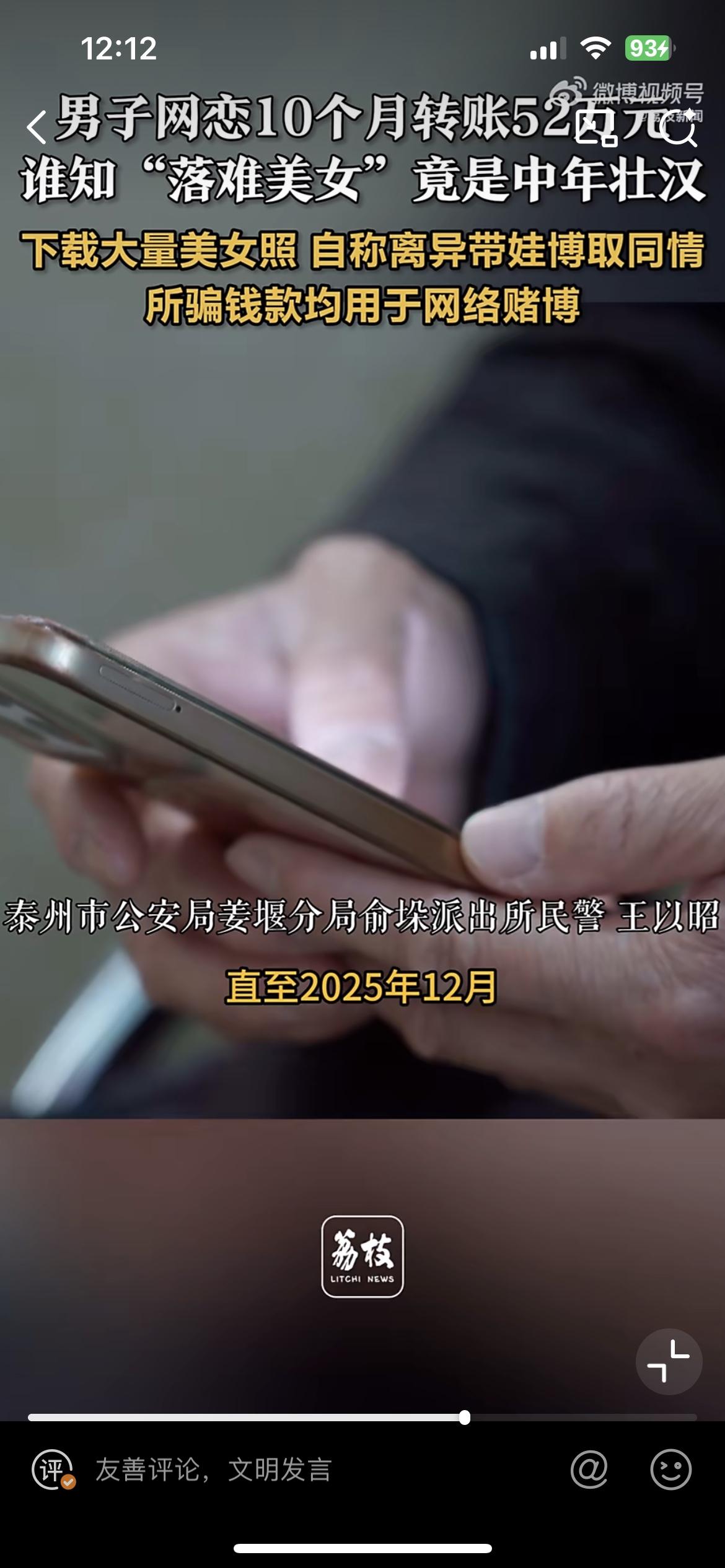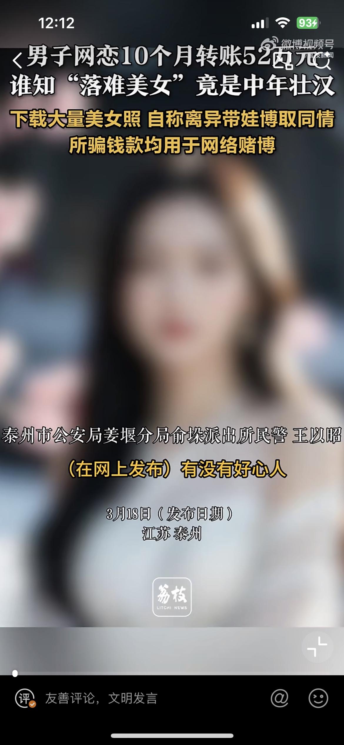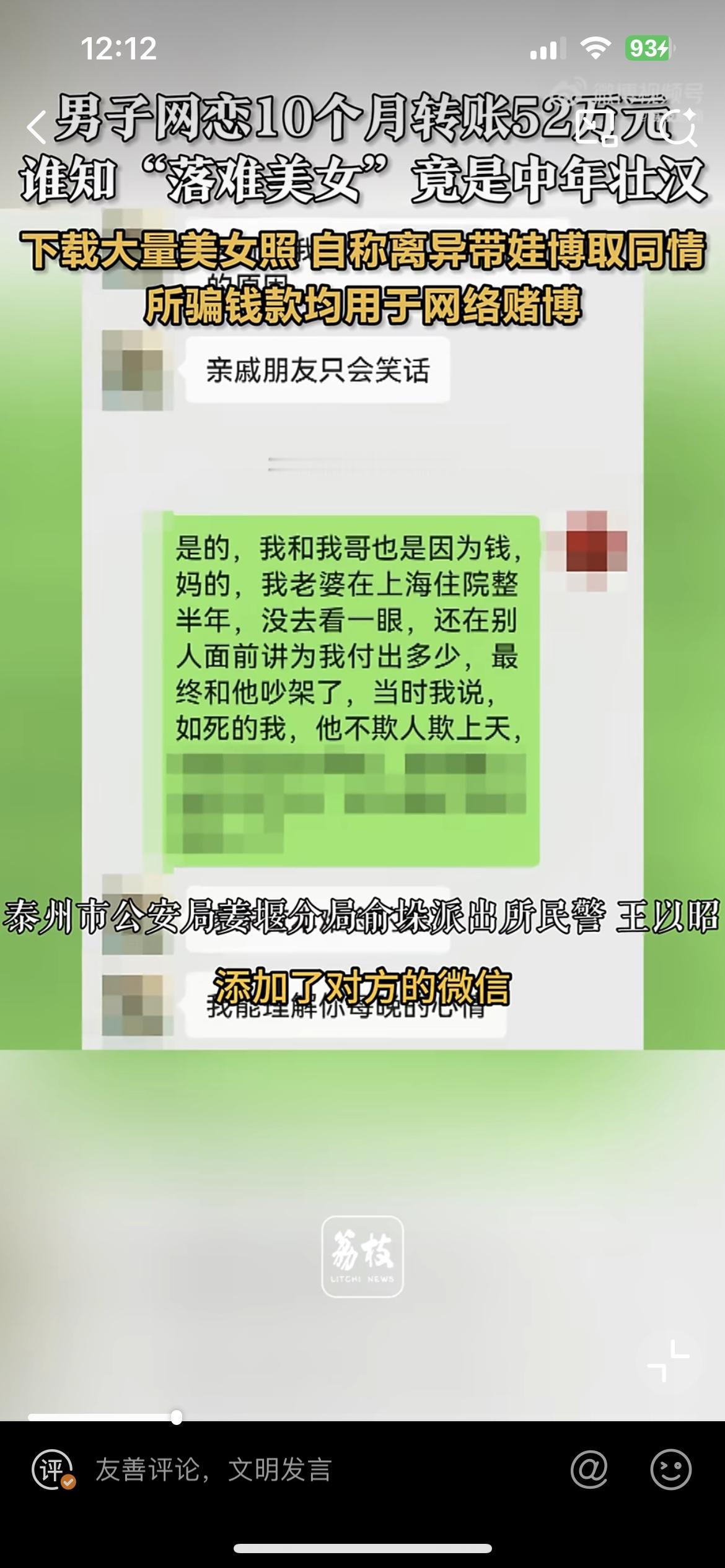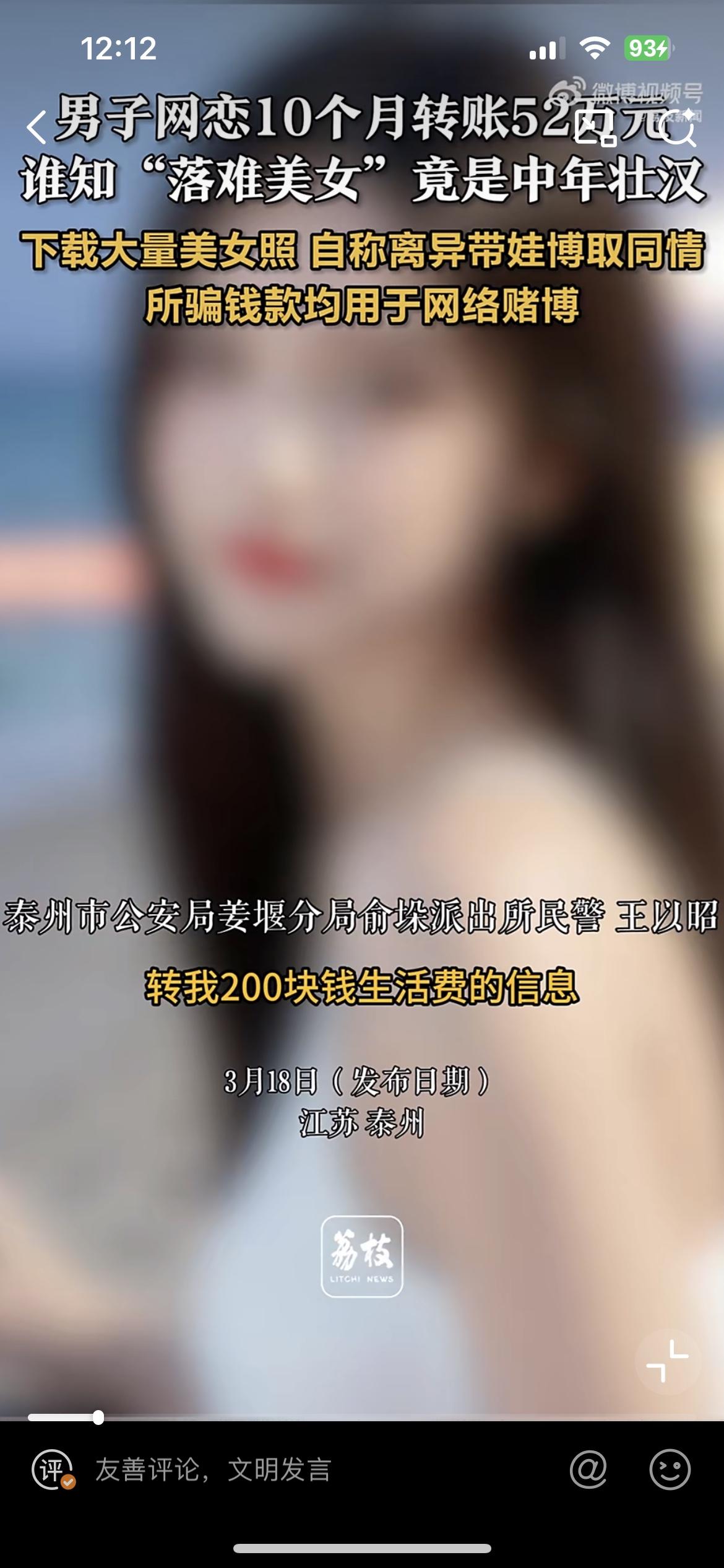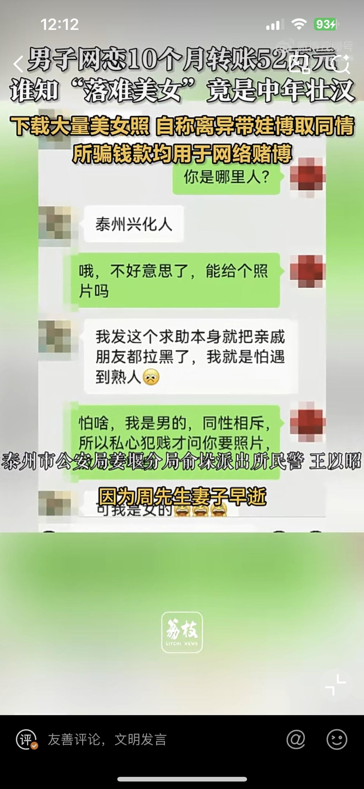 江苏兴化的周某天塌了,花 52 万网恋的对象竟然是个抠脚大汉。单身多年寂寞难耐的周某在短视频上面看到一个面容姣好的女子求助,说谁给自己 200 块生活费。动了恻隐之心的周某加了女子的微信,给她转账 200 块,让她好好生活。女子娇滴滴的样子,时常对周某嘘寒问暖,让周某心头一热,两人谈起了恋爱。女子开始以各种借口找周某要钱,周某有求必应,短短几个月就给女子转账 50 多万。当周某提出见面的时候,女子却以各种理由推脱。预感上当的周某报警,警察根据转账记录很快就查到对面的女子竟然是个中年汉子,周某顿感眼前一黑。