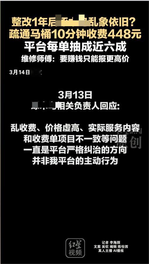 “屡教不改?”近日,一女子称,春节期间,自己因家中马桶堵塞,便在某平台下单了一项疏通服务,到场后,对方仅用钢丝绳疏通了10分钟,便收费448元。事后,她发现收费工单上写着下楼检修等项目,可实际上并没有执行。网友:平台乱象太多了! 又是一年315,每年这段时间,总会曝出一大堆问题,有新的,也有旧的,甚至有些,是已经被警告处罚过的。 据媒体3月14日报道,杨女士称,自己春节期间被“宰”了。事发当日,女子家中的厕所堵了,便在平台上下了个单,找人疏通。师傅上门后,十分钟收费了448元,包含了100的春节服务费。 收费高并不是问题,让杨女士感到生气的是,对方给她的收费单上,竟然写的“打捞疏通楼下拆检修口”。实际上,维修师傅就用钢丝绳疏通了十分钟,单子上写的打捞,还有楼下拆检修口,根本就没有做过。 一气之下,陈女士找了平台投诉。平台给杨女士退回了全部金额,并给了1000元的举报奖励。 事后,有多名维修师傅透露,他们也是没办法,平台一单要抽六成,他们想赚钱就只能往高了报。值得一提的是,去年,该平台就曾因乱象多而被央视点名批评。 网友看后表示,平台确实方便了不少,可是抽成也太多了。不仅如此,现在很多平台就像个吸血鬼一样,用户跟服务两头都吸,有点利润全让平台占了,确实需要好好管管了! 信息来源:《整改1年后啄木鸟乱象依旧?疏通马桶10分钟收费448元 平台每单抽成近六成 维修师傅:要赚钱只能报更高价》红星新闻