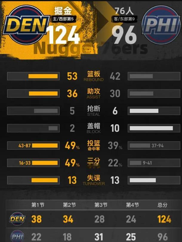 约基奇全场只拿8分,掘金还能赢76人28分?这比赛压根儿就不是一个级别的较量!124-96看着热闹,实则跟喝白开水似的——解渴,但没味儿。 好家伙,76人这首发名单念出来我都替他们心酸:格兰姆斯、埃奇库姆、爱德华兹、巴洛、博纳。这都谁啊?恩比德、马克西、乔治、乌布雷全躺病床上,摆明了往乐透区俯冲。比彻姆16分就是队内最高,你能指望这支"发展联盟联队"赢球?从开场第一分钟起,防守就跟纸糊的一样,目送掘金空切、三分。 半场72-40,分差32分,比赛第二节就花得透透的。约基奇打了25分钟,8分7板14助,传球跟玩儿似的,半场10助攻继续刷新中锋历史纪录。布劳恩9中7砍22分,卡梅隆·约翰逊三分3中3拿18分——为啥这么准?因为76人给的空位跟大海一样宽,防守轮转慢得跟散步似的。 这球治愈在哪儿?在这场"虐菜局"里,掘金展示了什么叫"游刃有余"。约基奇没发力就刷历史纪录,布劳恩、约翰逊找手感,穆雷从上一场1投14中的阴影里爬出来拿12分。这是强队该有的松弛感——该紧的时候紧,该松的时候松。 76人摆烂是战略性放弃,掘金赢球是战术性储备。这场球告诉咱们:赢球不重要,重要的是怎么赢。掘金用一场28分大胜宣告:西部第五,我们回来了。真正的硬仗还在后头,但这种"白开水"式的胜利,恰恰是季后赛长跑里的必需品——解渴,养精蓄锐,为真正的对决蓄力。布劳恩22分约基奇8分 掘金大胜76人