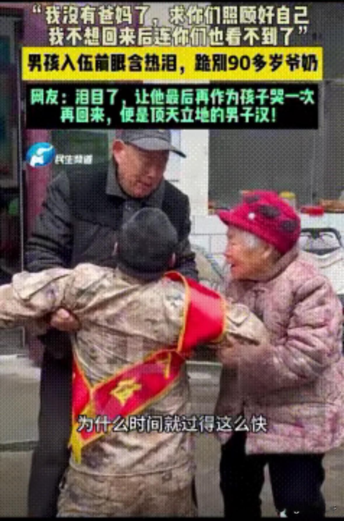 “泪目了!”河南周口,一名即将入伍的小伙和爷爷奶奶告别,爷爷以为孙子会直接转身离开,刚要准备招手再嘱咐一下时,孙子竟后退几步跪了下来!爷爷赶紧上前去扶,孙子却像小时候一样在爷爷的怀里,哭得稀里哗啦。 没人知道,这个刚满十八的小伙,是在怎样的牵挂里长大。 他没见过父母的模样,从记事起,眼里就只有爷爷奶奶佝偻的背影和布满老茧的手。九十岁的爷爷,九十一岁的奶奶,用一辈子的力气,把他从襁褓里的婴孩,养到能扛起钢枪的青年。 日子苦的时候,老两口把仅有的白面省给他,自己啃红薯干;上学的学费,是爷爷扛着锄头在田埂上攒下的,是村里邻里凑起来的,更是国家一笔笔资助托起来的。他没说过太多感谢的话,可这些细碎的温暖,早就在他心里扎了根,长成了要护着爷爷奶奶、护着这个家的念头。 这一跪,不是作秀,不是煽情。是他站在人生的岔路口,第一次要离开这个养他十八年的小院,第一次要直面“可能再也见不到”的恐惧。 他怕自己走后,爷爷奶奶没人端茶倒水,怕夜里爷爷咳嗽时没人递杯热水,怕奶奶揉着膝盖念叨他的时候,连个应声的人都没有。 他哭着把脸埋进爷爷的怀里,像小时候摔疼了那样,把所有的不安和不舍都倒出来。爷爷的手掌早就没了年轻时的力气,却还是稳稳托住他的后背,声音抖着却坚定:“别跪!先讲大家,再顾小家。”奶奶在一旁抹着眼泪,拉着他的胳膊,嘴里反复念叨:“交给国家就放心,这是又给你找了个新家。” 围观的乡亲们红了眼,没人上前打断。他们看着这个从小在巷子里跑大的孩子,从瘦得跟柴火似的小不点,长成了穿迷彩服的挺拔青年,也看着这对老夫妻,把所有的光都给了这个没了爹娘的孙儿。 有人偷偷抹泪,有人拿出手机拍下这一幕,没有刻意的摆拍,只有最朴素的亲情在流淌。视频传到网上,无数网友跟着破防。有人说,这是他最后一次做个孩子哭,再回来,就是顶天立地的男子汉。有人说,这一跪,跪的是养育恩,也是家国情。 没人能苛责他的眼泪。十八岁的年纪,本该在父母怀里撒娇,可他早早学会了扛事,学会了把委屈咽进肚子里。 入伍的决定,不是一时冲动,是他想给爷爷奶奶一个安稳的晚年,想给这个受过太多苦的家,挣一份荣光。他知道,穿上军装,就意味着要把小家的牵挂,换成对大家的担当。可在临行前的这一刻,他只想做回那个需要爷爷奶奶疼的孩子,把藏了十八年的依赖,都哭给这对给了他全部的老人。 爷爷把他扶起来,帮他理了理迷彩服的领口,又把他的军帽重新戴正。奶奶塞给他一个布包,里面是煮好的鸡蛋,还有她攒了好久的零钱,说“到了部队好好干,别惦记家里”。他攥着布包,对着爷爷奶奶深深鞠了一躬,转身踏上了送兵的车。车开的时候,他没敢回头,怕看见爷爷奶奶站在门口的身影,怕自己忍不住跳下车,再抱一抱他们。 后来有人问他,后不后悔这一跪。他说,不后悔。这一跪,是给爷爷奶奶的交代,也是给自己的承诺。他会在部队里好好训练,好好成长,等下次回来,要让爷爷奶奶看到,他们的孙儿,已经能成为他们的依靠,能成为守护家国的脊梁。 这世上最动人的情感,从来都不是惊天动地的壮举,而是藏在这些细碎的离别里。 是老人用一生托举孩子的未来,是孩子带着牵挂奔赴使命,是小家与大家之间,最朴素也最厚重的联结。它没有华丽的辞藻,却能戳中每个人心里最柔软的地方,让我们看见,亲情与担当,从来都不是选择题,而是可以并肩同行的力量。 各位读者你们怎么看?欢迎在评论区讨论。