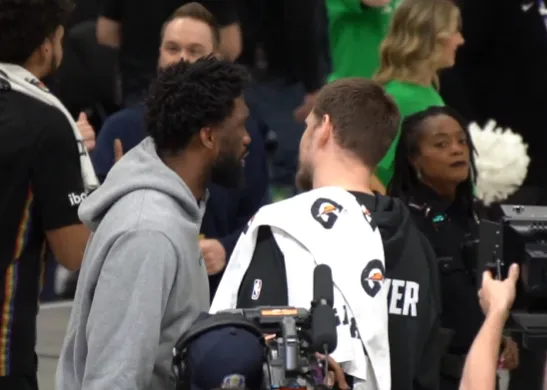 此役,恩比德因伤缺席,但他赛后找到了约基奇,两人拥抱并寒暄了一番。