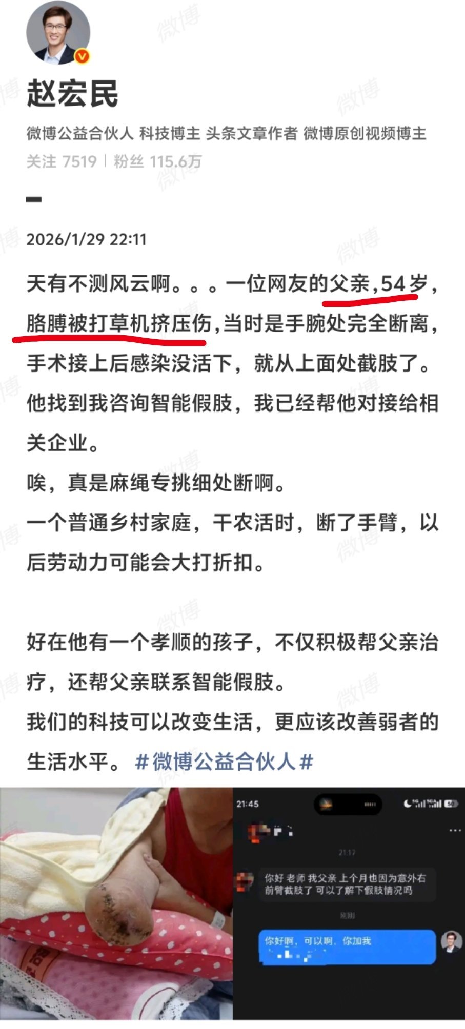 #智能假肢# 2025年12月,甘肃一位53岁的大叔,手掌卷进收玉米的机器里造成的手臂残疾,他的家人看到我发的智能假肢的内容,联系咨询智能假肢安装费用和流程,已经对接。大概价格是10.8万~16.8万。