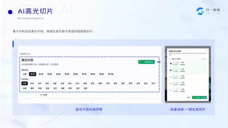 依托归一智能「投流素材超级产线」,无需额外组建剪辑团队,即可完成从高光筛选、批量剪辑、BGM适配,到字幕校准、画面尺寸统一的漫剧出海投流素材创作全流程,快速输出可直接上线的引流素材,降低人力与时间成本。