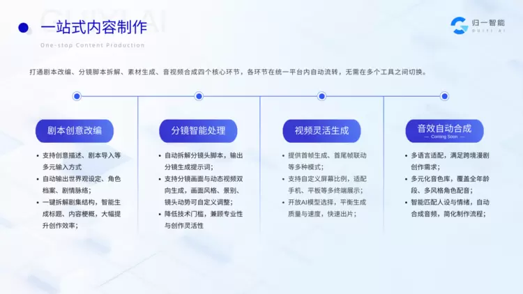 从全链路生产技术突破到传播素材赋能,归一智能「AI漫剧超级产线」专注于漫剧出海一站式服务,突破漫剧出海多语言适配、跨文化优化等技术难题,构建了“技术研发—海外内容制作—发行投放”的AI漫剧全链路内容服务体系,为漫剧出海创作者提供技术与服务支持。