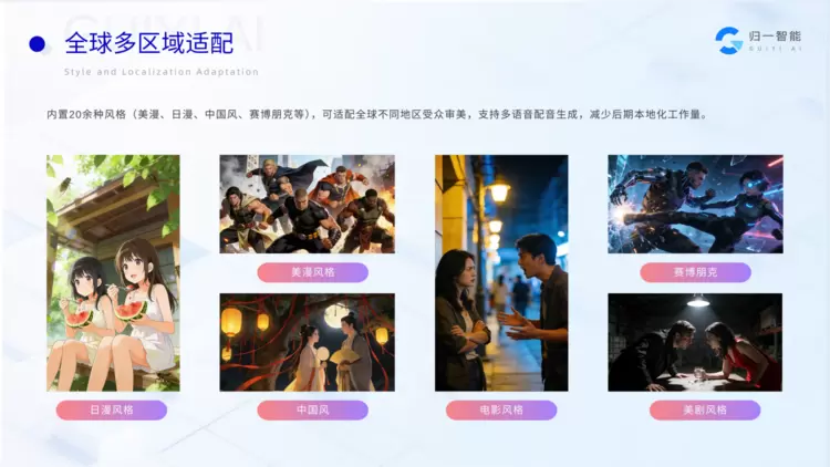 为满足漫剧出海的全球化内容创作需求,归一智能在「AI漫剧超级产线」中内置了20余种主流漫画美术风格,涵盖美漫、日漫、国风、赛博朋克、写实、Q版等多种视觉体系,可针对不同地区、不同受众的审美偏好进行精准适配,帮助创作者快速打造符合海外市场需求的AI漫剧内容。