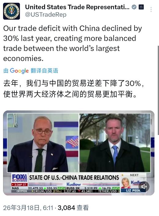 美国贸易代表格里尔今天(北京时间3月18日)写道:“去年,我们与中国的贸易利差下降了30%,使世界两大经济体之间的贸易更加平衡。”   我们先锚定这30%贸易利差下降的核心载体。格里尔口中的贸易利差,本质是美国对中国的贸易逆差。逆差收窄30%,不是单一因素推动的结果。   它是中美双方在2025年经贸往来中多重变化叠加的产物。美国商务部在3月中旬发布的2025年度美中贸易统计报告里,明确记录了这一数据。2025年美国对中国的贸易逆差总额从2024年的3800多亿美元,回落至2660亿美元左右。这个降幅刚好精准落在30%的区间里。   美国对华出口的大幅增长是逆差收窄的核心推手。2025年美国对中国的出口额同比增长了22%。这个增速创下了近五年新高。美国的能源产品、农产品和高端制造业设备,成为对华出口的主力。   中国在2025年持续扩大对美国页岩油、液化天然气的进口。能源进口额同比涨幅超过35%。   美国的大豆、玉米等农产品对华出口也保持了18%的增长。中国对美国农产品的进口需求持续稳定。美国的半导体设备、航空航天零部件等高端制造产品,对华出口同样实现了20%以上的增长。中国高端制造业的升级,让美国相关产品的出口空间进一步打开。   中国对美出口的结构调整,也在间接促成逆差收窄。2025年中国对美出口额同比仅增长了3%。这个增速远低于美国对华出口的增速。   中国对美出口的产品结构正在发生明显变化。传统劳动密集型产品比如服装、玩具、家具的出口额同比下降了12%。   这些产品的出口份额被东南亚等地区分流。而中国的新能源汽车、光伏产品、锂电池等高端制造产品,对美出口同比增长了40%。这类高附加值产品的出口占比持续提升。虽然总量增长,但并没有像传统产品那样大幅推高中国对美出口总额。这也间接促成了逆差的收窄。   全球供应链的重构,是推动美中贸易逆差收窄的另一重要因素。2025年中美两国企业都在加速调整供应链布局。美国企业减少了从中国中间品的进口,转而在北美地区寻找替代供应商。中国企业也在优化对美出口的供应链模式。   企业减少了中间环节的贸易流转,让双边贸易的统计数据更贴近实际贸易额。同时,中美在半导体、新能源等领域的经贸合作深化,也让双边贸易的品类更加多元。贸易不再过度依赖单一的劳动密集型产品。贸易结构的优化让逆差收窄成为必然趋势。   格里尔将逆差收窄30%定义为贸易更加平衡。这个说法有一定的表面依据,但不能简单等同于真正的贸易平衡。真正的贸易平衡,是双向贸易的规模和结构都处于合理区间。它不是单一的逆差收窄。2025年美中双边贸易总额虽然有所变化,但依然保持了10%以上的总量。   只是贸易流向和结构发生了变化。美国在能源、农产品等领域的对华出口增长,弥补了部分逆差。但美国在高科技产品对华出口上,依然存在诸多限制。这也是影响双边贸易真正平衡的关键因素。   这一贸易逆差的收窄,对中美双方都产生了实际影响。对美国而言,对华出口的增长带动了美国国内相关产业的发展。能源、农业、高端制造等行业的企业订单增加。就业岗位也有所提升。美国的消费者也能以更合理的价格获得中国的高端制造产品。   双方实现了互利共赢。对中国而言,对美出口结构的优化,推动了国内高端制造业的升级。新能源、光伏等产业的国际竞争力进一步提升。中国也通过扩大从美国的进口,满足了国内能源和农产品的需求。同时促进了中美经贸关系的稳定发展。   美中贸易逆差收窄30%,也对全球贸易格局产生了深远影响。中美作为全球第一和第二大经济体,双边贸易的变化会直接传导至全球供应链和贸易体系。美国对华出口的增长,带动了北美能源和农业产业的发展。这也让全球能源和农产品的贸易格局发生了一定变化。   中国对美出口的结构升级,也为全球高端制造产品的贸易树立了标杆。它推动了全球产业升级的进程。同时,中美贸易结构的优化,也让全球供应链更加多元化。它减少了对单一地区的依赖,提升了全球贸易的稳定性。   我们也要看到,美中贸易逆差的收窄是一个动态的过程。它不是一成不变的。2026年的全球经济形势依然存在诸多不确定性。中美经贸往来也会面临新的挑战。真正的贸易平衡,需要中美双方持续深化合作。双方需要打破贸易壁垒,扩大双向贸易的规模。双方还需要优化贸易结构。格里尔的表态,只是对2025年美中贸易数据的一个总结。   而未来的双边贸易走向,依然取决于双方的共同努力。只有坚持互利共赢的原则,中美两国才能在经贸领域实现更深层次的合作。两国才能让世界两大经济体的贸易真正走向可持续的平衡。这也会为全球经济的发展注入更强劲的动力。
