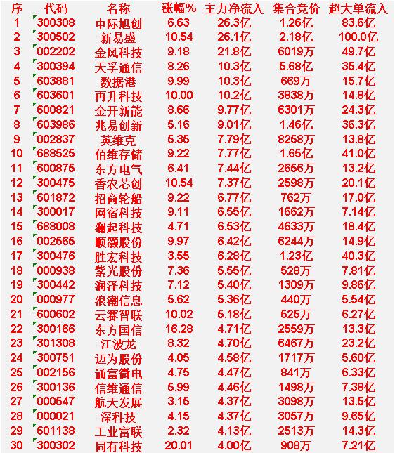 3月18日收盘,卖出的30名单: 排在第1位的是东山精密,主力净流出17.6亿。 排在第2位的是比亚迪,主力净流出7.82亿。 排在第3位的是协鑫集成,主力净流出7.50亿。 排在第4位的是山子高科,主力净流出7.17亿。 排在第5位的是中国海油,主力净流出6.32亿。 排在第6位的是华电新能,主力净流出5.43亿。 排在第7位的是顺钠股份,主力净流出5.22亿。 排在第8位的是宁德时代,主力净流出5.09亿。 排在第9位的是节能风电,主力净流出4.72亿。 排在第10位的是洲际油气,主力净流出4.71亿。 3月18日收盘,买入的30名单: 中际旭创:净流入26.3亿 新易盛:净流入26.1亿 金风科技:净流入21.8亿 天孚通信:净流入10.3亿 数据港:净流入10.3亿 再升科技:净流入10.2亿 金开新能:净流入9.77亿 兆易创新:净流入9.01亿 英维克:净流入7.79亿 佰维存储:净流入7.77亿 东方电气:净流入7.44亿 香农芯创:净流入7.37亿 招商轮船:净流入6.77亿 网宿科技:净流入6.55亿 澜起科技:净流入6.53亿 顺灏股份:净流入6.42亿 胜宏科技:净流入6.28亿 紫光股份:净流入5.55亿 润泽科技:净流入5.40亿 浪潮信息:净流入5.36亿