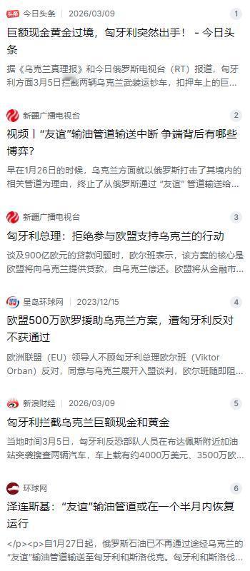 俄乌战场变天了,泽连斯基突然放狠话,要军事打击一个北约成员国,这个北约国家更牛,称有本事你就来打,这个国家就是匈牙利,匈牙利还真不怕。   麻烦看官老爷们右上角点击一下“关注”,方便您进行讨论和分享,感谢您的支持!   最近俄乌战场那边局势有点微妙,但更热闹的反而是后方两个邻居彻底撕破了脸。就在3月5号,匈牙利干了一件让整个欧洲目瞪口呆的事儿——反恐部队直接在自家境内动手,把乌克兰的两辆武装运钞车给扣了。车里搜出来的东西让人眼红:除了4000万美元和3500万欧元现金,居然还有9公斤金条,总值换算下来可不是小数目。车上7名乌方人员也被带走问话,虽然人后来放了,但这口气乌克兰哪咽得下?基辅那边直接炸了锅,外长瑟比加张嘴就给匈牙利扣了顶"国家恐怖主义"的大帽子 。   这事儿的背景其实没那么简单。说白了,这就是能源掐架引发的血案。早在一个多月前的1月底,乌克兰就突然把通往匈牙利的"友谊"输油管道给切了,理由是俄罗斯袭击了管道设施,没法继续输油。可匈牙利这边压根不信,觉得这就是乌克兰在搞能源施压。要知道这条管道对匈牙利可是命根子,大部分石油都靠它从俄罗斯过来。断油之后匈牙利工业立刻感到疼了,总理欧尔班气得牙痒痒,直接把这笔账记在了心上 。   更火上浇油的是,乌克兰这时候还想要欧盟的900亿欧元援助。欧盟想通过这个计划给乌克兰续命,但匈牙利手里握着一票否决权,欧尔班直接摆明了态度:想让我点头?先把输油管道给我恢复了再说。乌克兰那边显然没料到匈牙利这么硬,一怒之下,乌克兰国家安全局一个前中将甚至公开发飙,对欧尔班和家人发出了死亡威胁。这下彻底把私人恩怨上升到了国家对立,匈牙利反恐部队这时候动手扣车,显然是有备而来 。   匈牙利外长西雅尔多后来放话更狠,他说这几个月乌克兰通过匈牙利过境的现金加起来有9亿美元和4.2亿欧元,还有146公斤金条。他直接灵魂发问:既然是银行间的正经转账,干嘛不走电子银行,非得整这么多现金和金条偷偷摸摸拉过来?还专门派武装人员押运,跟乌克兰安全部门还有扯不清的关系?这钱到底是援助款、军购款还是洗钱?匈牙利一句"怀疑跟军事黑手党有关"就把案子定性成了刑事调查,摆出一副公事公办的样子,乌克兰再急也没用 。   乌克兰那边也是一肚子委屈,国家储蓄银行跳出来喊冤,说这些钱其实是帮奥地利合作伙伴转运的,你们匈牙利凭啥扣?但匈牙利根本不接这茬,总理欧尔班直接在竞选集会上表态,说"我得搞清楚这些钱怎么进他们口袋的,肯定得弄明白"。这话听起来像查案,实际上等于公开打脸:我不信你乌克兰是干净的。双方鸡同鸭讲,这梁子算是彻底解不开了 。   这场闹剧说到底,暴露的是北约和欧盟内部早就裂开的伤口。匈牙利虽然也是北约成员国,但在俄乌问题上一直跟主流唱反调,不肯给武器、不肯制裁俄罗斯能源,现在连钱都扣,完全不顾什么盟友面子。欧尔班甚至说过,乌克兰现在这情况加入欧盟简直是胡闹,坚决反对。而乌克兰那边泽连斯基也不是吃素的,嘴上虽然说要靠谈判解决,但国内强硬派早就把匈牙利当成了眼中钉,死亡威胁都出来了,这哪还是盟友,简直像仇人 。   更有意思的是匈牙利这边的底气。面对乌克兰暴跳如雷,布达佩斯从头到尾就一句话:有本事你来打啊。当然谁都知道乌克兰不可能真对北约成员国动武,但匈牙利敢这么硬刚,赌的就是乌克兰不敢翻脸。而且这招釜底抽薪玩得确实漂亮:你断我油,我就扣你钱,还打着反洗钱的旗号,让欧盟也没法拉偏架。更早之前匈牙利还联手斯洛伐克,反手就停了给乌克兰的柴油供应,彻底让乌克兰尝到断供的苦头 。   现在乌克兰那边估计肠子都悔青了,本来想拿能源当筹码逼匈牙利就范,结果筹码没换成,反而丢了7000多万欧元现金和金条。更麻烦的是,如果匈牙利咬着"调查洗钱"不放,这些钱很可能就肉包子打狗了。而匈牙利这边也没打算息事宁人,摆明了要把这事查个底朝天。双方这一闹,不光让俄乌战场的注意力被转移,更让全世界看到:所谓的西方阵营团结,在真金白银和能源饭碗面前,根本不值几个钱 。   说到底,国际政治就是这么现实。匈牙利敢扣车,赌的就是乌克兰没能力开辟"第二战场";乌克兰敢断油,赌的也是欧盟会给自己撑腰。结果两边都高估了自己,也低估了对方的狠劲。现在这局面,欧盟夹在中间里外不是人,想劝和吧,两边都不给面子;想制裁吧,又怕内部分裂更严重。接下来不管是运钞车案还是输油管,哪个处理不好都可能让北约和欧盟脸上无光 。