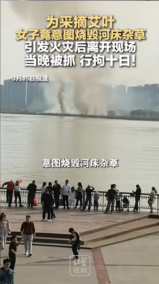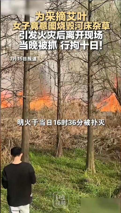 “这下后悔了吧!”近日,湖南湘江新区,一公园附近的滩涂上,女子为了方便自己采摘艾叶,竟然点着了上面的杂草。没想到,火势失去了控制,女子溜之大吉。经过一个半小时的扑救,火势被扑灭了,万幸没有人员伤亡和财产损失。网友:必须严惩! 千里之堤毁于蚁穴,许多大的事故,最终的原因都是些不起眼的细节,尤其是火灾。人为引发的火灾,往往最开始都是存了侥幸心理,觉得就只有点小火苗,没有大事,最后一发不可收拾,害了人也害了己。 据媒体3月15日报道,事发当日下午,66岁的女子许某,想要采摘滩涂上的艾叶,她觉得上面的这些杂草碍了事,为了方便自己,就起了烧掉的心思。 点火后不久,意外发生了,火势逐渐脱离了女子的控制,女子察觉后赶紧逃离了现场。随着火越着越厉害,引起了其他人的关注,消防人员也赶到了现场。经过全力扑救,火情终于被扑灭了。 幸运的是,此次火灾仅是滩涂上芦苇等杂草着了,并没有人员伤亡,也没有其他财产损失。 事发后,公安机关进行了调查,很快就将女子给抓到了,女子也承认了是自己放的火。最后被公安机关依法行政拘留十日。 网友看后表示,放火烧山,牢底坐穿。虽然这次没有造成人员伤亡,但谁知道下次什么样呢?女子年纪这么大了,只是拘留十日,在里面还得好吃好喝好供着,真的能起到教育作用么?别出来之后再故技重施,引起更大的灾难! 信息来源:《为采摘艾叶 女子竟意图烧毁河床杂草 引发火灾后离开现场 当晚被抓 行拘十日!》红星新闻