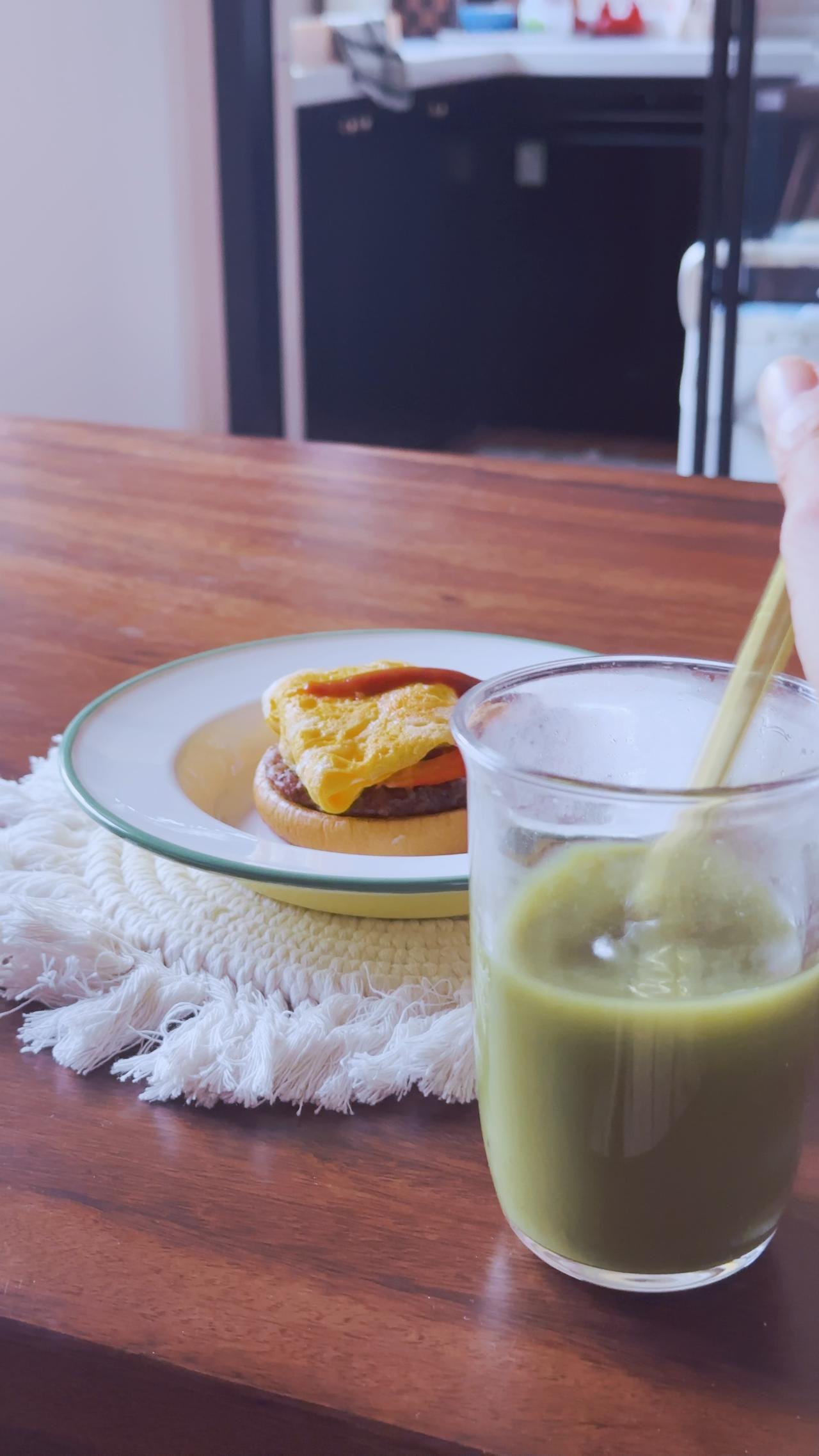 今天的早餐很顶 昨天的汉堡加热,再加一个蛋,去掉一半的汉堡胚,就可以吃了~ 一杯抹茶粉泡水,可以消肿~减脂抹茶
