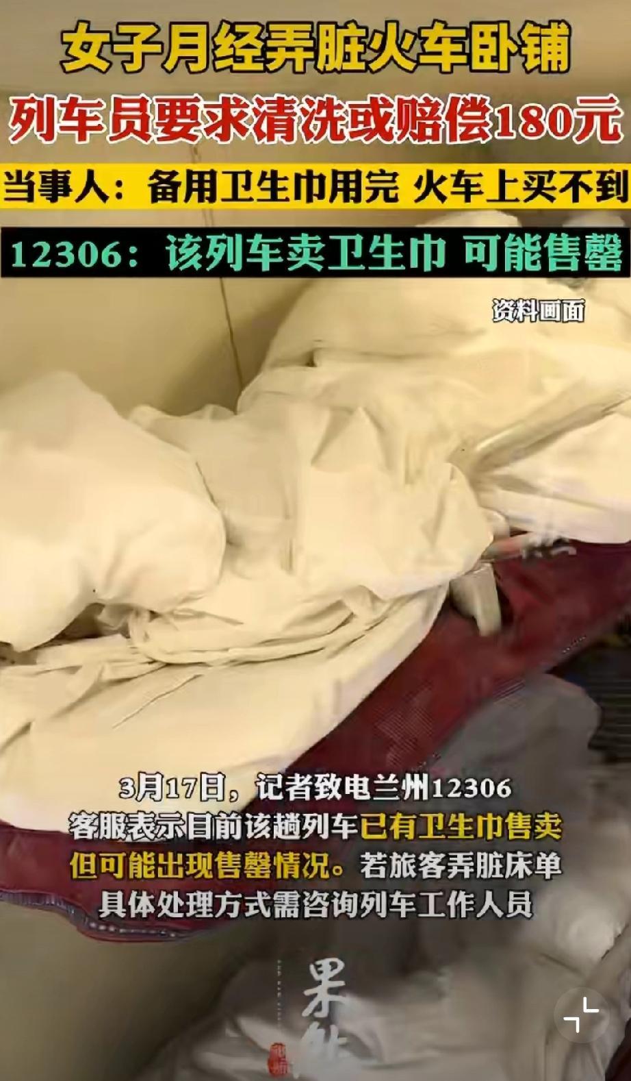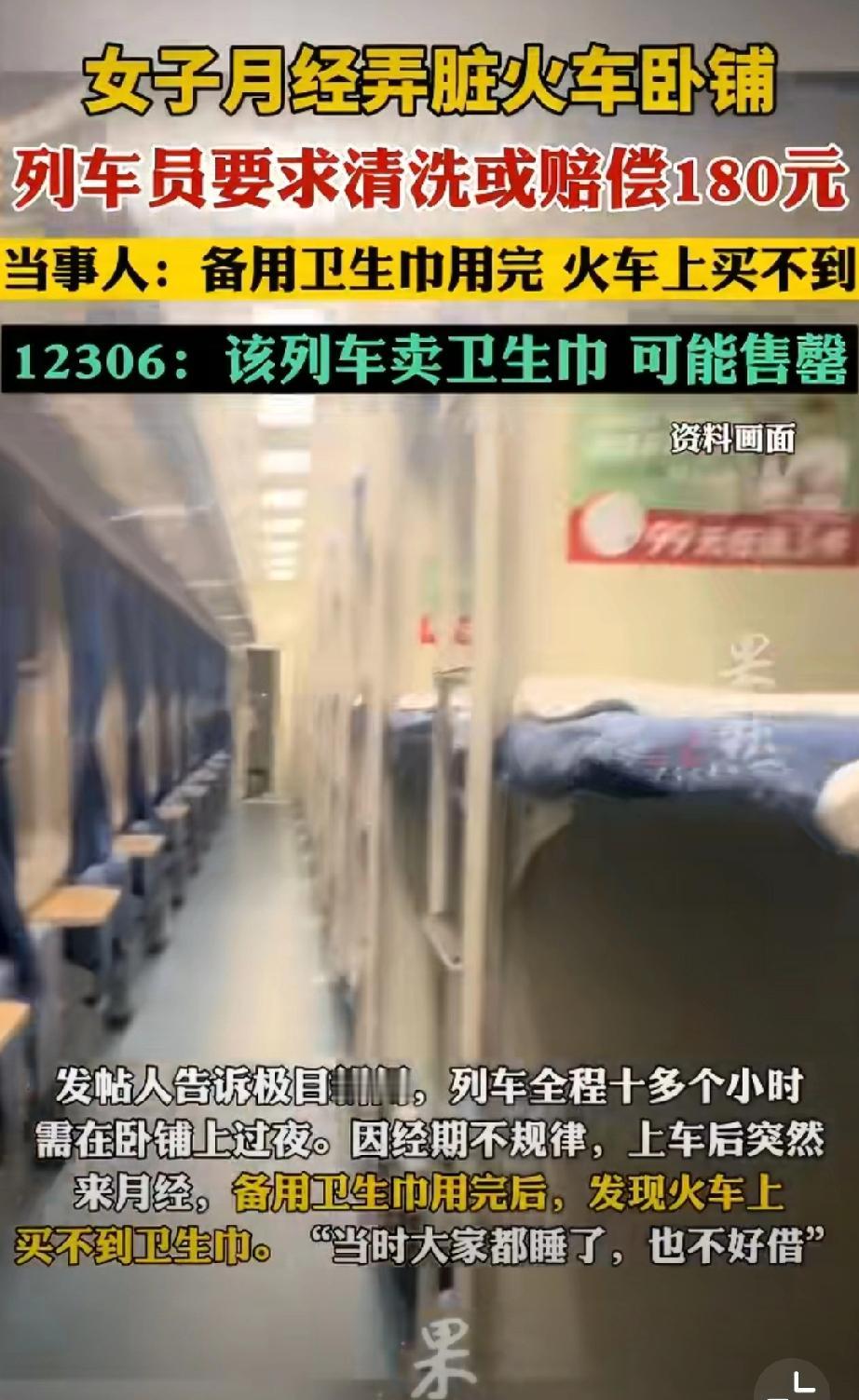 “女子月经弄脏火车卧铺被让赔180元”连续上热搜很离谱…同样的新闻,年前上过几次了,年后某些新闻媒体再次包装又上了两次…事情经过是咋样的呢? 女子坐卧铺时因突然来月经弄脏床单,被工作人员要求自行清洗干净或赔偿180元(其实大部分人是选择去厕所洗洗)。 该网友承认自己有责任,也认可损坏财物需赔偿,但她提出疑问:“列车上会配售热水、零食和卫生纸,而卫生巾同样是女乘客的刚需,为什么没有售卖?” 第一,这个话题下媒体故意忽略了一个事实,这辆列车是有售卖卫生巾的;第二,也没有一个女性出来说明,假如列车上售卖卫生巾,就能避免月经弄脏床单了吗?我看从月信突来的说,也是很难避免的。 那为什么媒体和大V们就抓牢列车要售卖卫生巾一个劲的发?高铁脱鞋风波 卫生巾尴尬瞬间 火车尴尬事件