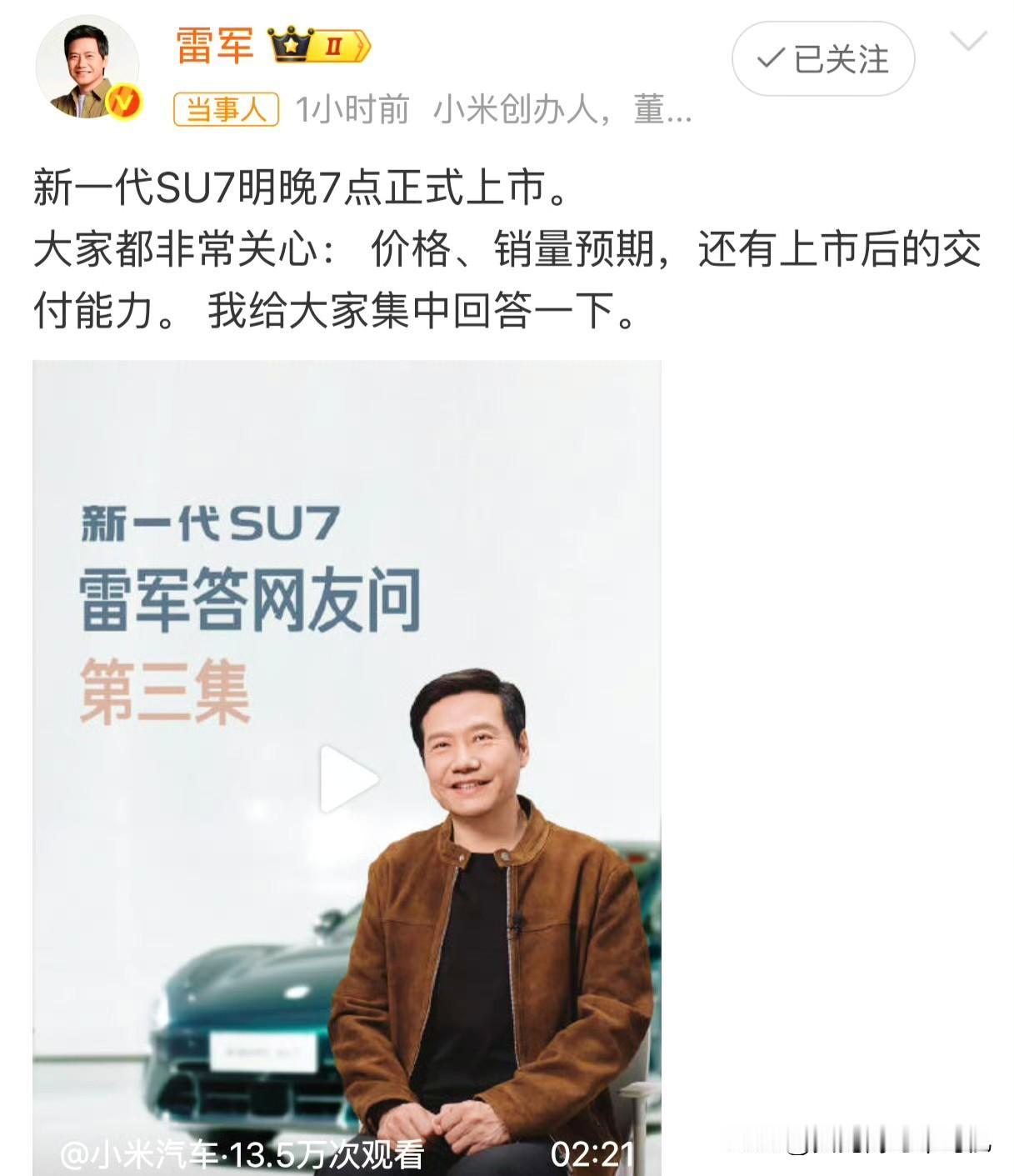 给雷军一个大大的赞,小米汽车确实没有让老车主感到被“背刺”。 新一代SU7早早就开始预热,同时也同步停产了老款车型。 新款明确会涨价,走的是“大升级+小幅涨价”的路线,全系标配了激光雷达、Thor芯片、2200MPa超强钢以及9个安全气囊等硬核配置。 相信雷总这次的新一代SU7也能延续热销势头。 第一代车型在两年内卖出了38万辆,成绩相当亮眼。 大家猜猜看,这一代新车在今年一年能卖出多少辆?