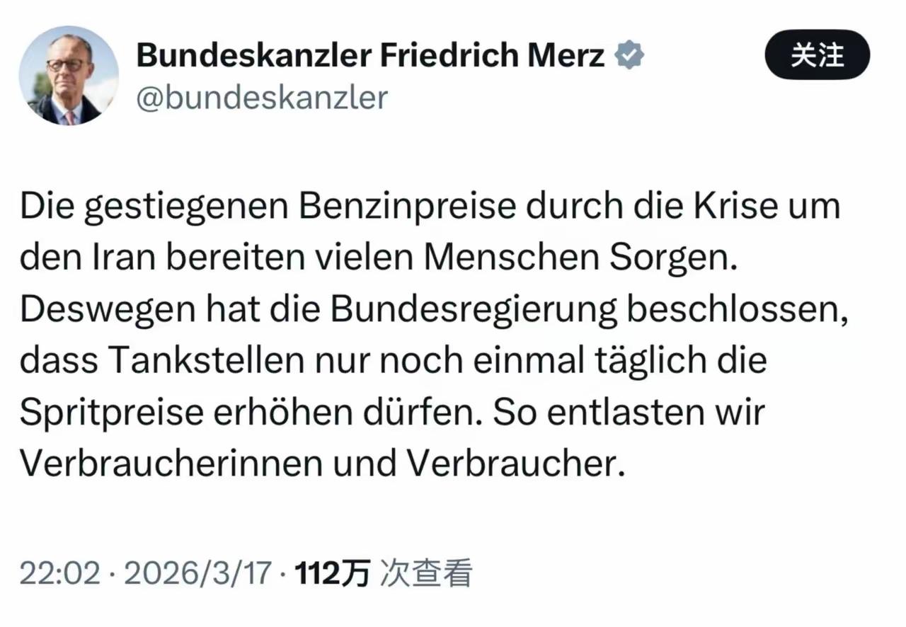 德国总理默茨17日在平台上发文称:“伊朗危机导致油价上涨,令人担忧。因此,德国政府决定,加油站每天只准涨价一次,以减轻消费者的负担。” 看来德国的加油站之前已经到了每天多次涨价的程度了,不然政府不会限制一天只准涨一次。 之前俄乌战争欧盟最受伤的是德国,这次美以攻打伊朗最受伤的依然是德国。然而德国人直到现今都没有追究北溪2号线被炸的责任。难怪魏德尔曾多次公开呼吁追究对乌克兰炸毁北溪2号线的责任,并要求对其索赔700亿欧元的线相关费用。 一场俄乌战争,让德国没了廉价能源成本,国内化工行业及工业制造破产的破产,搬走的搬走,以至于他们的工业4.0发展成了工业0了。工业的空心化,依然没有带来德国政府改变他们那可笑的意识形态。这些政客依旧打着这可怜的意识形态,大行其事。 只是苦了企业与民生了。要知道早在2025年8月23日,默茨就在德国下萨克森州奥斯纳布吕克市基民盟州级党代会上发言称:“以我们当前的经济产出,已无法维持现有的福利国家体系。”更何况半年时间过去了,德国经济依然毫无起色。但油价成本被中东这场战争再度推高,特别是欧洲天然气更是大涨56%,而德国天然气价格最高峰时期更是涨了108%,哪怕现在有所回落,也依然涨了65%。其电力价格也跟着水涨船高,涨幅达到23.3%。 所以德国人开始怀念被自己亲手摧毁的核能了,但他们依然很神奇地不会怀念俄能。哪怕在默克尔时代,德俄关系如此之好。但换了一任总理之后,意识形态大行其事之后,德国忽然像和俄罗斯结了死仇一样,这就很有意思了。 只是这不禁让人想问一句:德国,你这样做的利益是什么呢?得到了什么呢?似乎什么都没得到,还损失了一大堆?