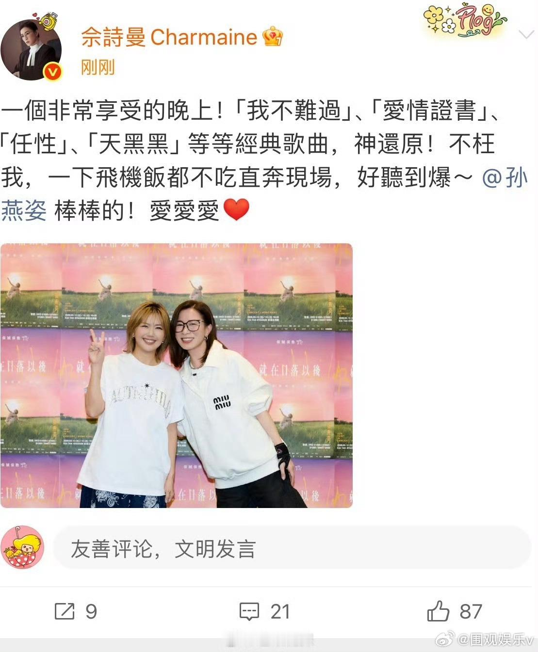 佘诗曼晒与孙燕姿合照佘诗曼孙燕姿后台合照佘诗曼现身孙燕姿就在日落以后演唱会香港站
